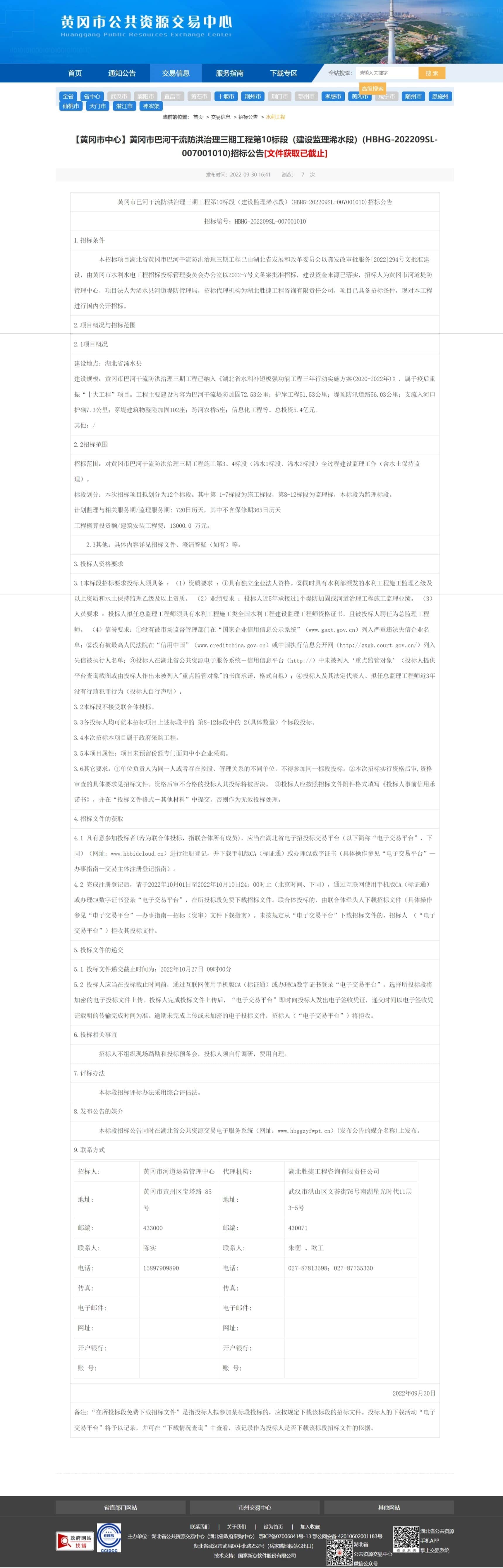 【黄冈市中心】黄冈市巴河干流防洪治理三期工程第10标段(建设监理浠水段)(HBHG-202209SL-007001010)招标公告