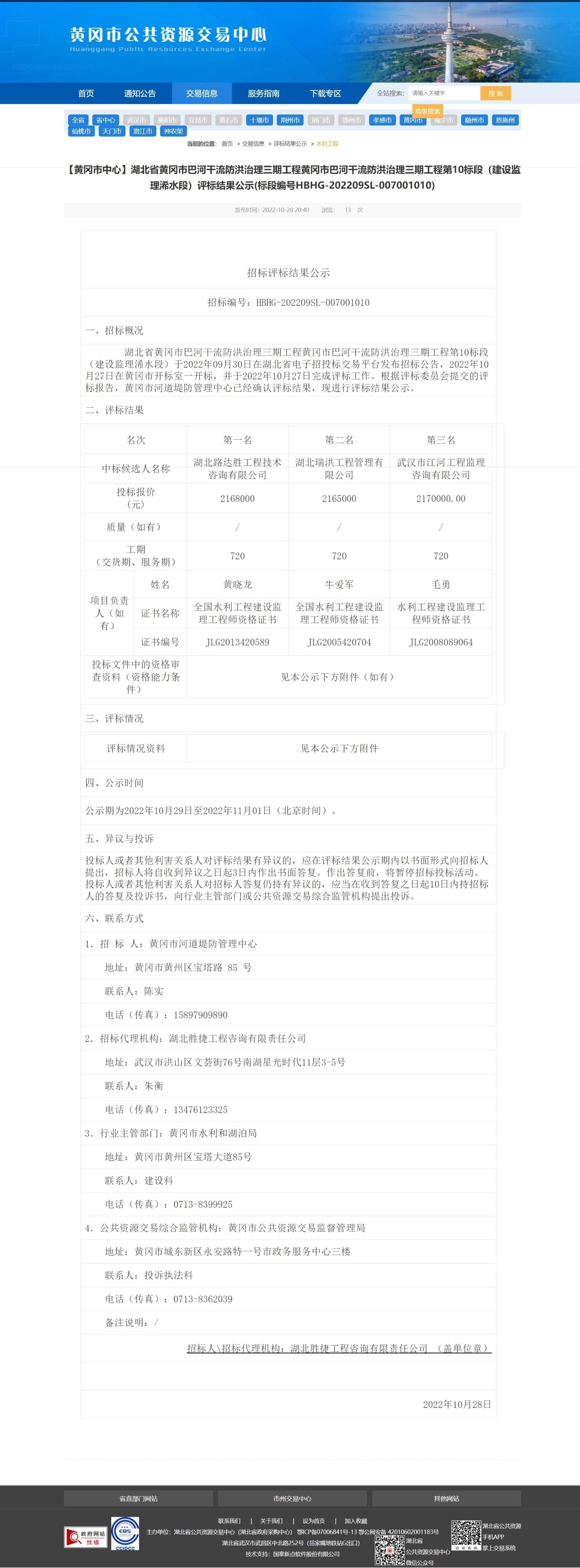 【黄冈市中心】湖北省黄冈市巴河干流防洪治理三期工程黄冈市巴河干流防洪治理三期工程第10标段(建设监理浠水段)评标结果公示(标段编号HBHG-202209SL-007001010)