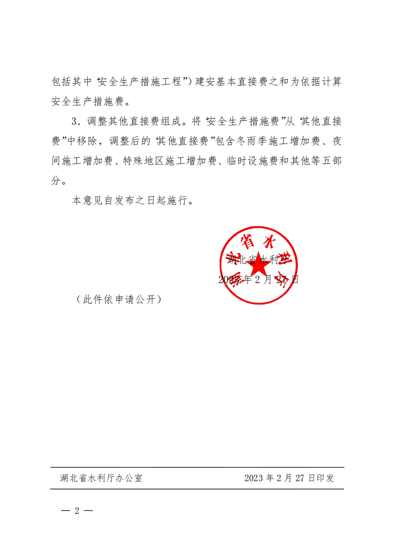 近日,水利部办公厅印发《关于调整水利工程计价依据安全生产措施费计算标准的通知》(办水总函〔2023〕38 号),调整了水利工程施工安全生产措施费计列标准。为推进新标准贯彻落实,且便于具体操作,现就执行《水利工程设计概(估)算编制规定》(水总〔2014〕429 号)及安全生产措施费计列新标准,提出暂行意见如下: