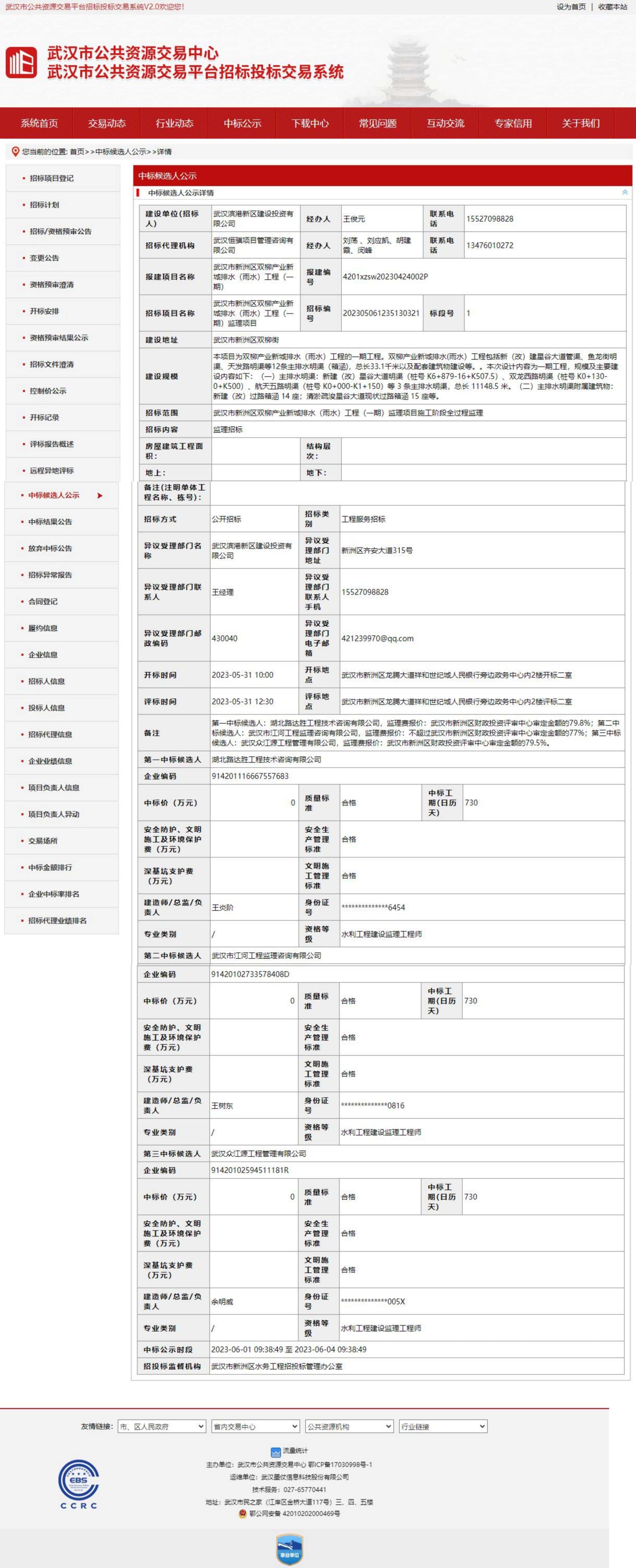 武汉市新洲区双柳产业新城排水(雨水)工程(一期)监理项目中标候选人公示