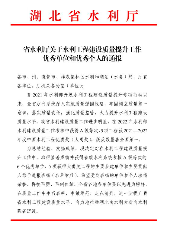 省水利厅关于水利工程建设质量提升工作优秀单位和优秀个人的通报