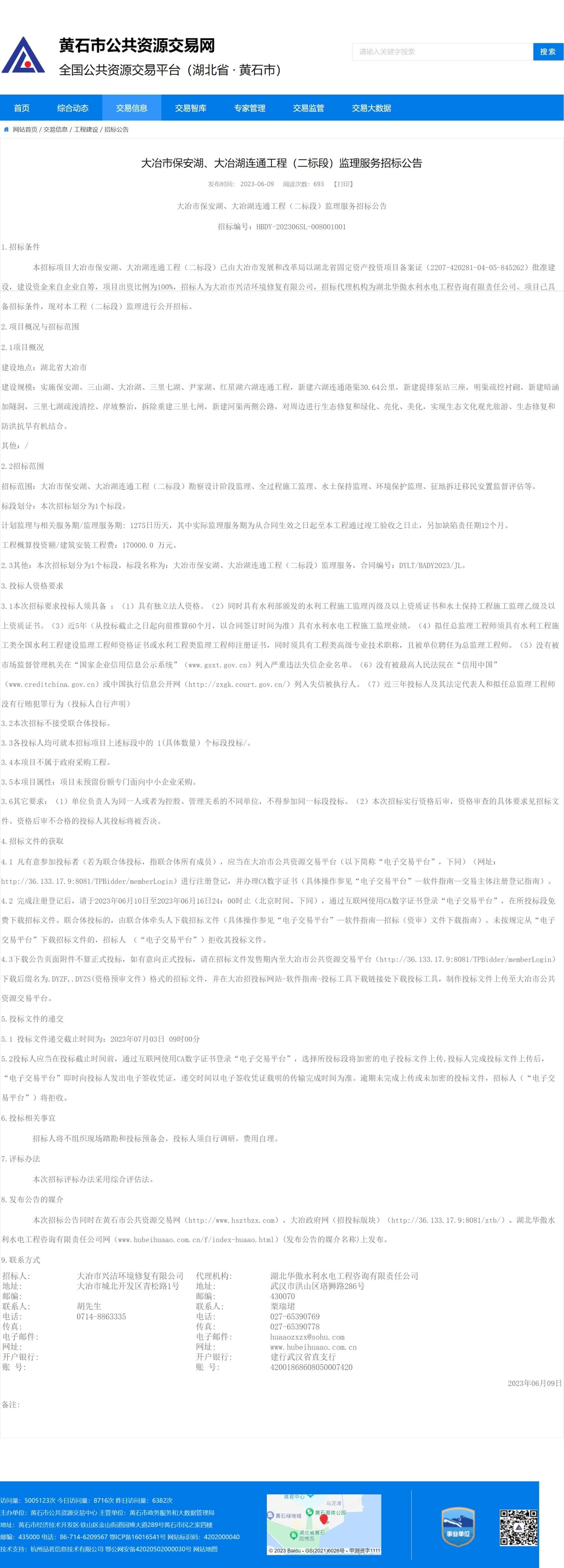 8.发布公告的媒介 本次招标公告同时在黄石市公共资源交易网(http://www.hsztbzx.com)、大冶政府网(招投标版块)(http://36.133.17.9:8081/ztb/)、湖北华傲水利水电工程咨询有限责任公司网(www.hubeihuaao.com.cn/f/index-huaao.html)(发布公告的媒介名称)上发布。