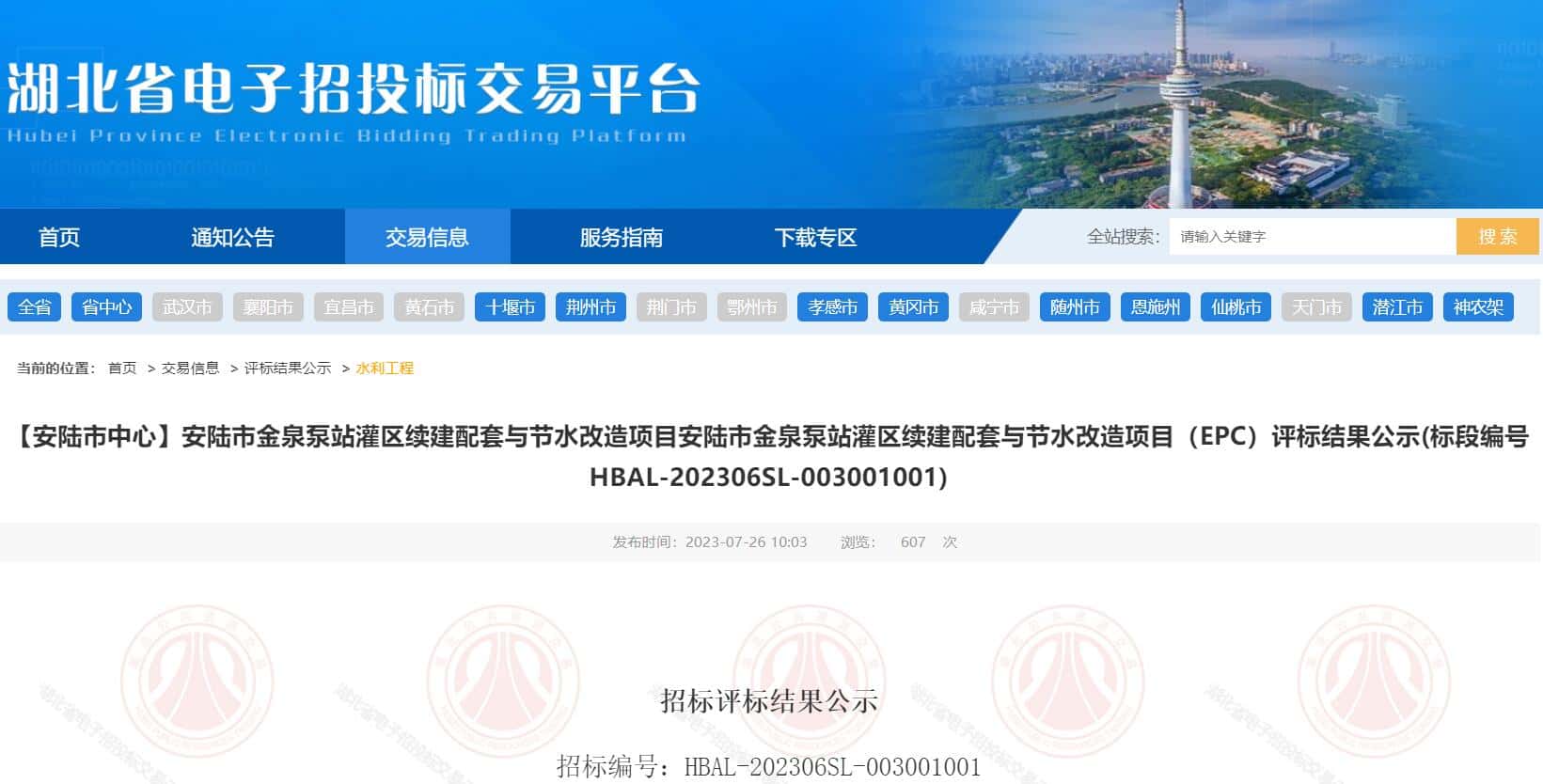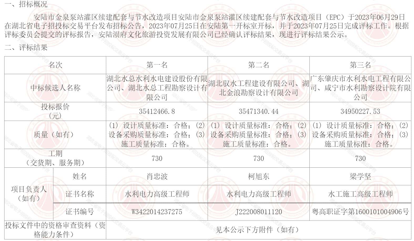安陆市金泉泵站灌区续建配套与节水改造项目安陆市金泉泵站灌区续建配套与节水改造项目(EPC)于2023年06月29日在湖北省电子招投标交易平台发布招标公告,2023年07月25日在安陆第一开标室开标,并于2023年07月25日完成评标工作。根据评标委员会提交的评标报告,安陆涢府文化旅游投资发展有限公司已经确认评标结果,现进行评标结果公示。