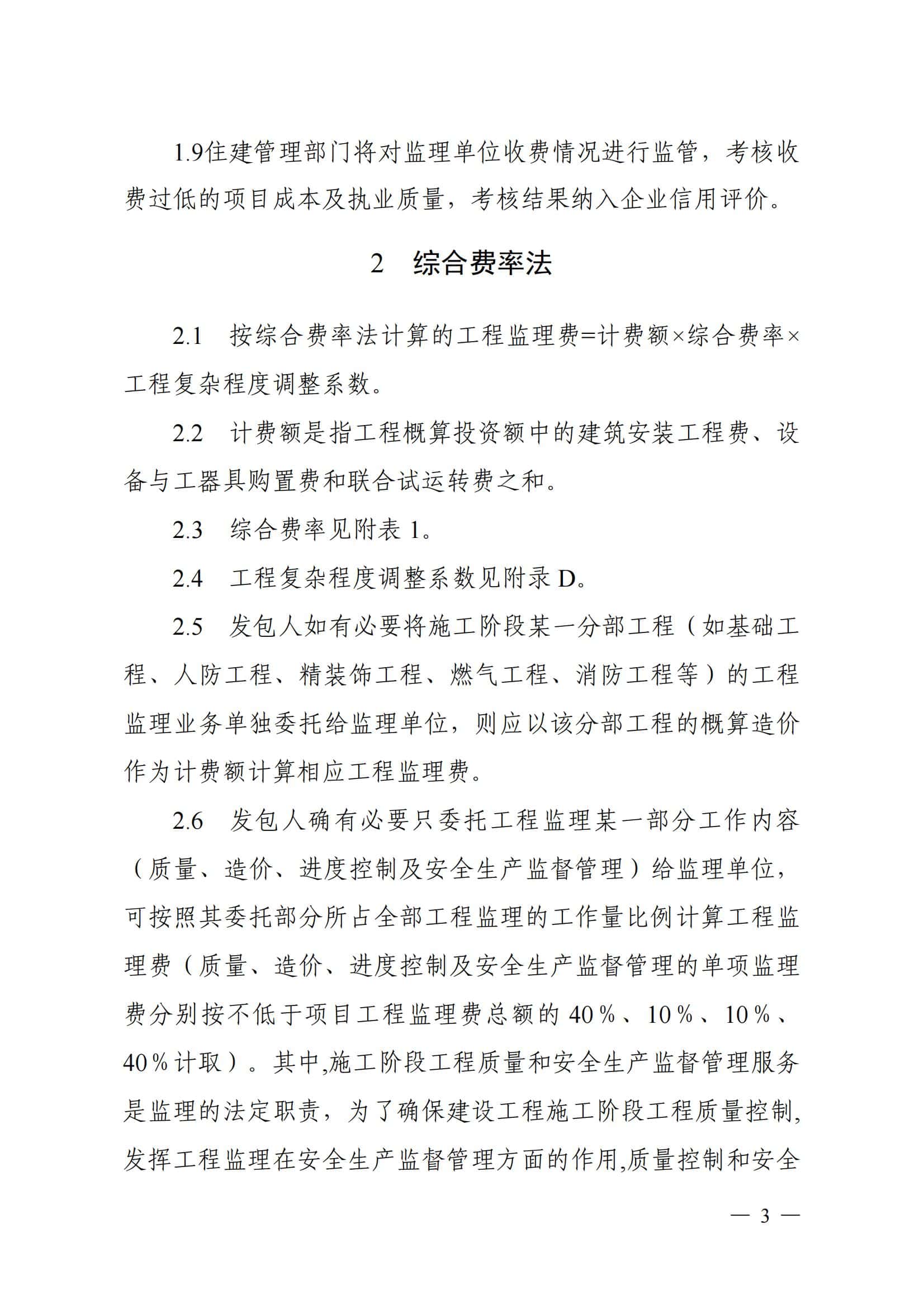 第二、三部分为监理与相关服务计费标准和方法。明确两种收费计费方式:一是综合费率法,以项目计费额为基础,按照一定的费率标准并考虑工程复杂程度(调整系数)计算工程监理费,具体计费比例可以在一定的浮动范围内由合约双方协商确定;二是人员综合费用法,以项目人员投入为基础,按各类监理人员综合费用标准、服务时间等计算工程监理费,并对项目监理机构人员配备提供参考标准。