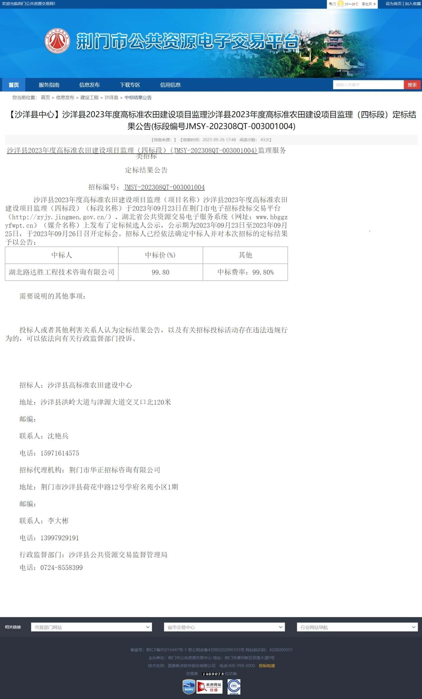 沙洋县2023年度高标准农田建设项目监理(项目名称)沙洋县2023年度高标准农田建设项目监理(四标段)(标段名称)于2023年09月23日在荆门市电子招标投标交易平台(http://zyjy.jingmen.gov.cn/)、湖北省公共资源交易电子服务系统(网址:www.hbggzyfwpt.cn)(媒介名称)上发布了定标候选人公示,公示期为2023年09月23日至2023年09月25日,于2023年09月26日召开定标会。招标人已经依法确定中标人并对本次招标的定标结果予以公告: