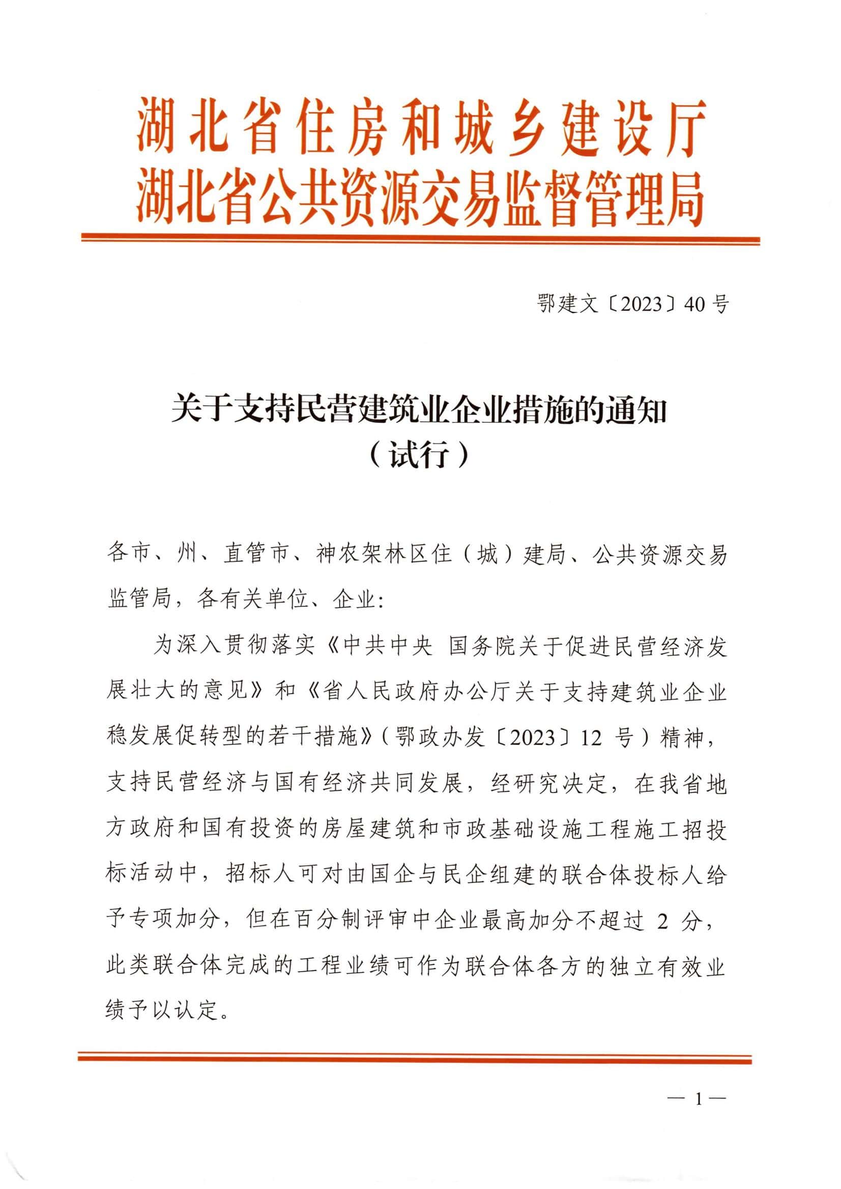 为深入贯彻落实《中共中央国务院关于促进民营经济发 展壮大的意见》和《省人民政府办公厅关于支持建筑业企业稳发展促转型的若干措施》(鄂政办发〔2023〕12号)精神,支持民营经济与国有经济共同发展,经研究决定,在我省地方政府和国有投资的房屋建筑和市政基础设施工程施工招投标活动中,招标人可对由国企与民企组建的联合体投标人给 予专项加分,但在百分制评审中企业最高加分不超过2分, 此类联合体完成的工程业绩可作为联合体各方的独立有效业绩予以认定。