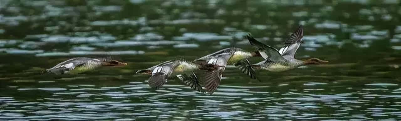 中华秋沙鸭在松滋洈水水库上方飞翔。图:新华网