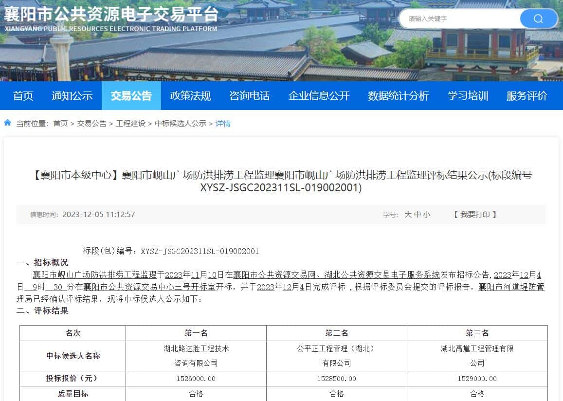 来源:襄阳市公共资源电子交易平台