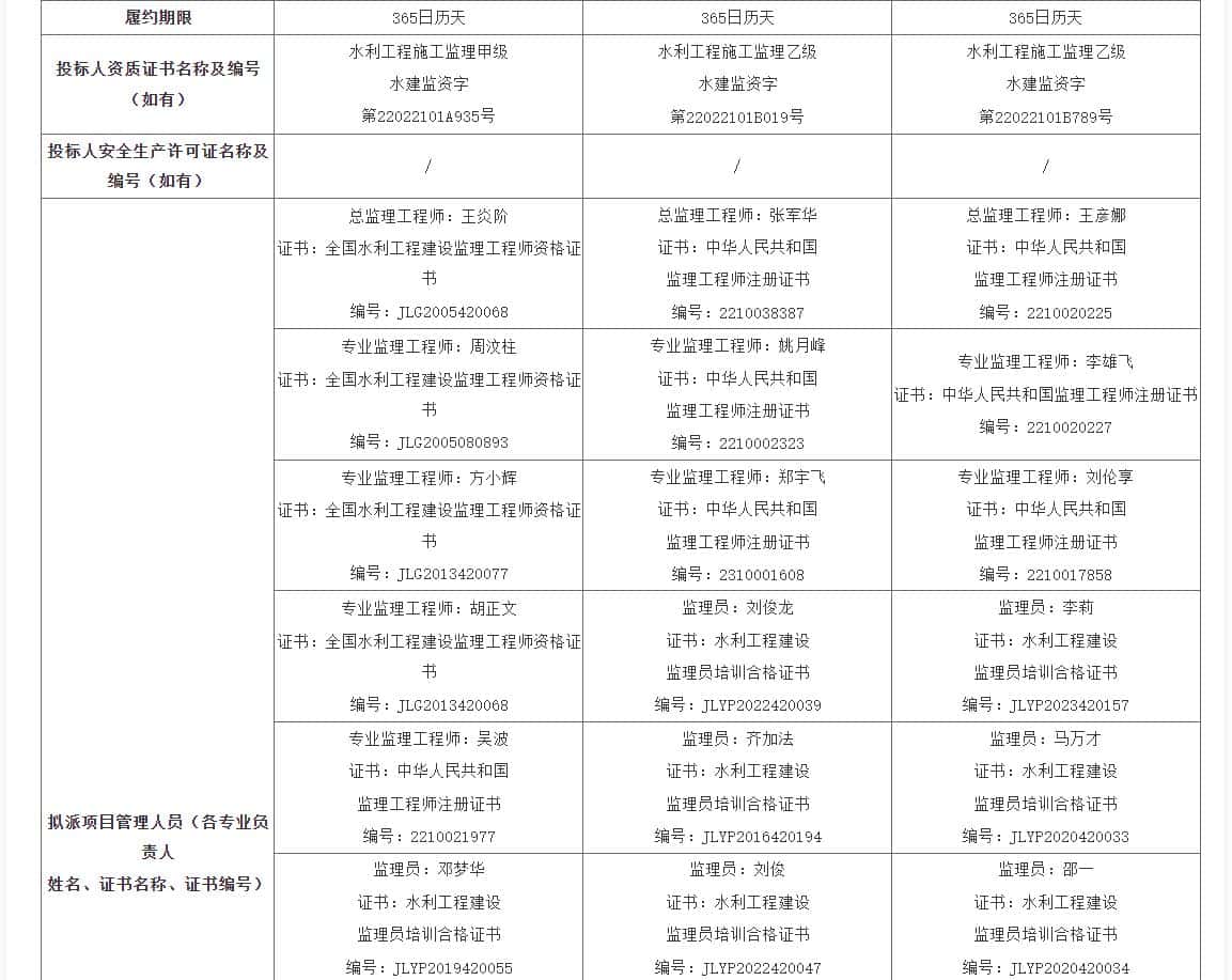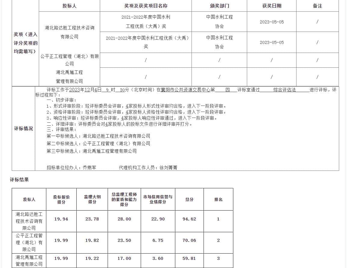 襄阳市岘山广场防洪排涝工程监理20231110日在襄阳市公共资源交易网、湖北公共资源交易电子服务系统发布招标公告,2023124 9 30 分在襄阳市公共资源交易中心三号开标室开标,并于2023124日完成评标 ,根据评标委员会提交的评标报告,襄阳市河道堤防管理局已经确认评标结果,现将中标候选人公示如下: