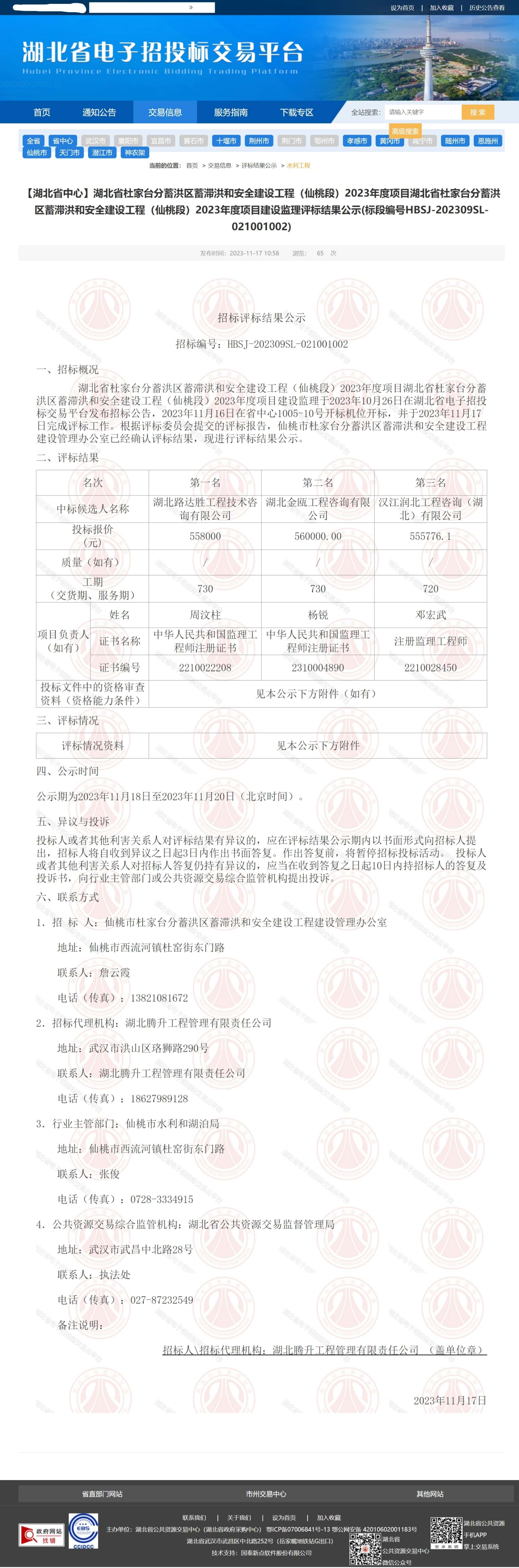 湖北省杜家台分蓄洪区蓄滞洪和安全建设工程(仙桃段)2023年度项目湖北省杜家台分蓄洪区蓄滞洪和安全建设工程(仙桃段)2023年度项目建设监理于2023年10月26日在湖北省电子招投标交易平台发布招标公告,2023年11月16日在省中心1005-10号开标机位开标,并于2023年11月17日完成评标工作。根据评标委员会提交的评标报告,仙桃市杜家台分蓄洪区蓄滞洪和安全建设工程建设管理办公室已经确认评标结果,现进行评标结果公示。