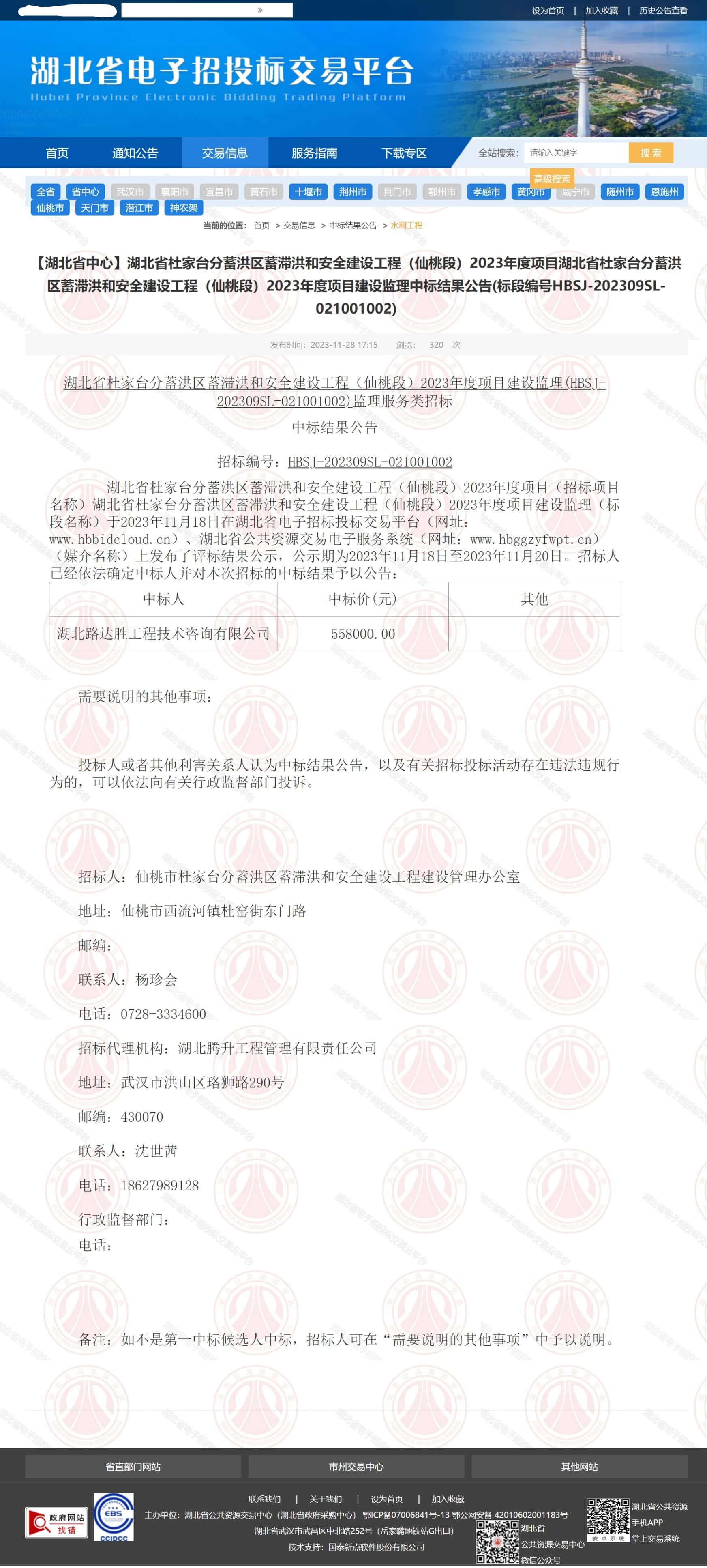 湖北省杜家台分蓄洪区蓄滞洪和安全建设工程(仙桃段)2023年度项目建设监理监理服务类招标中标结果公告