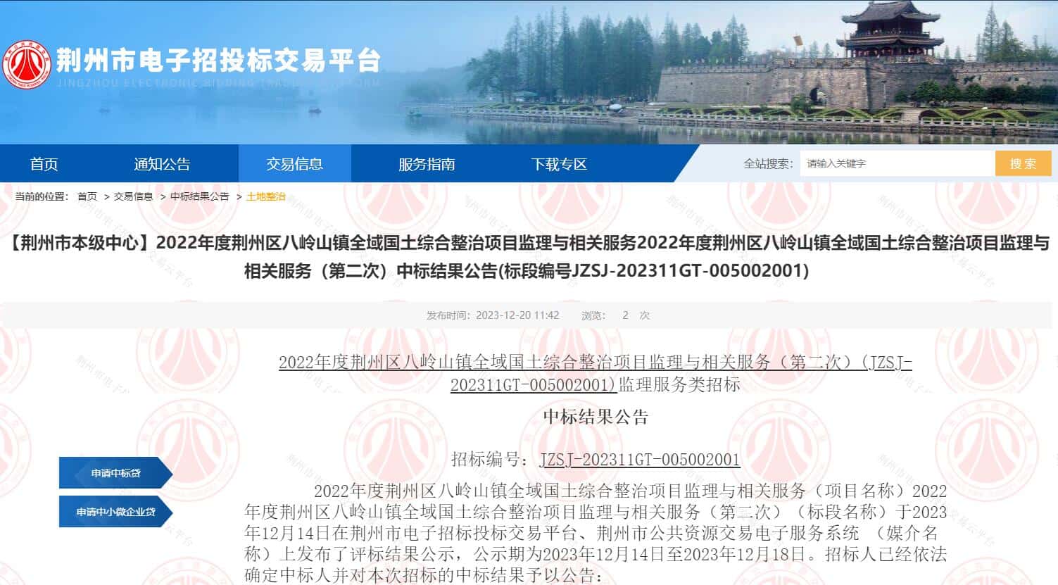 2022年度荆州区八岭山镇全域国土综合整治项目监理与相关服务(项目名称)2022年度荆州区八岭山镇全域国土综合整治项目监理与相关服务(第二次)(标段名称)于2023年12月14日在荆州市电子招标投标交易平台、荆州市公共资源交易电子服务系统 (媒介名称)上发布了评标结果公示,公示期为2023年12月14日至2023年12月18日。招标人已经依法确定中标人并对本次招标的中标结果予以公告: