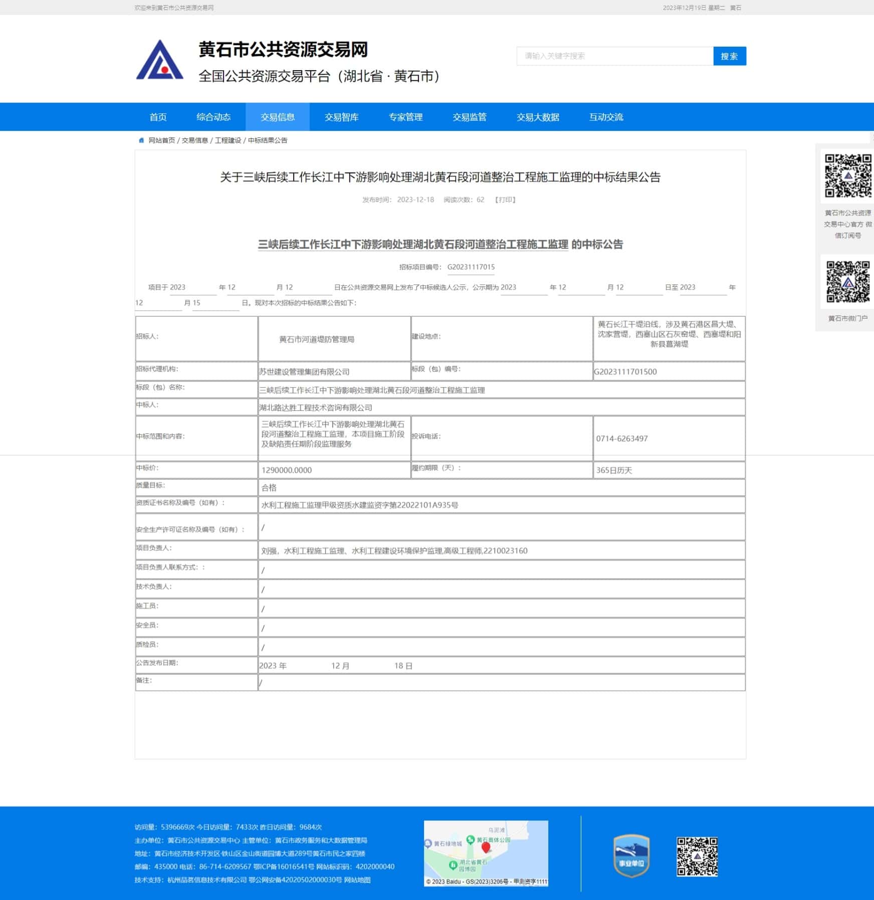 三峡后续工作长江中下游影响处理湖北黄石段河道整治工程施工监理 的中标公告