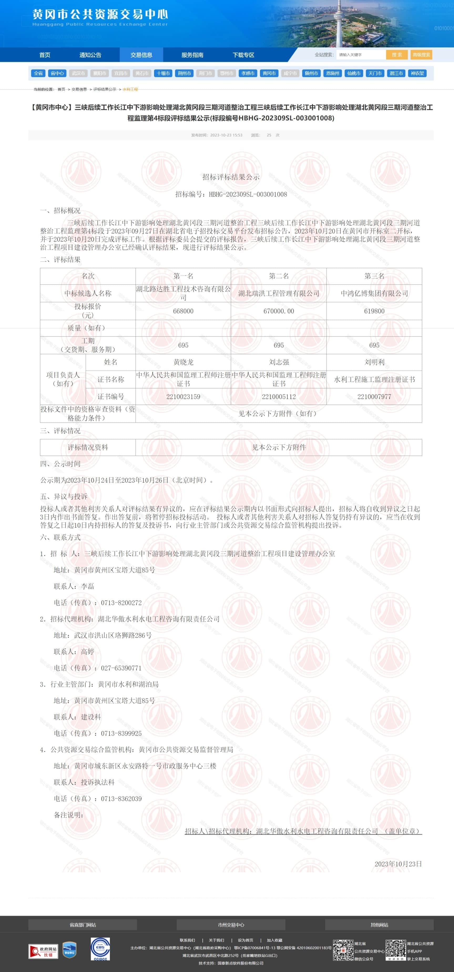 【黄冈市中心】三峡后续工作长江中下游影响处理湖北黄冈段三期河道整治工程三峡后续工作长江中下游影响处理湖北黄冈段三期河道整治工程监理第4标段评标结果公示(标段编号HBHG-202309SL-003001008)