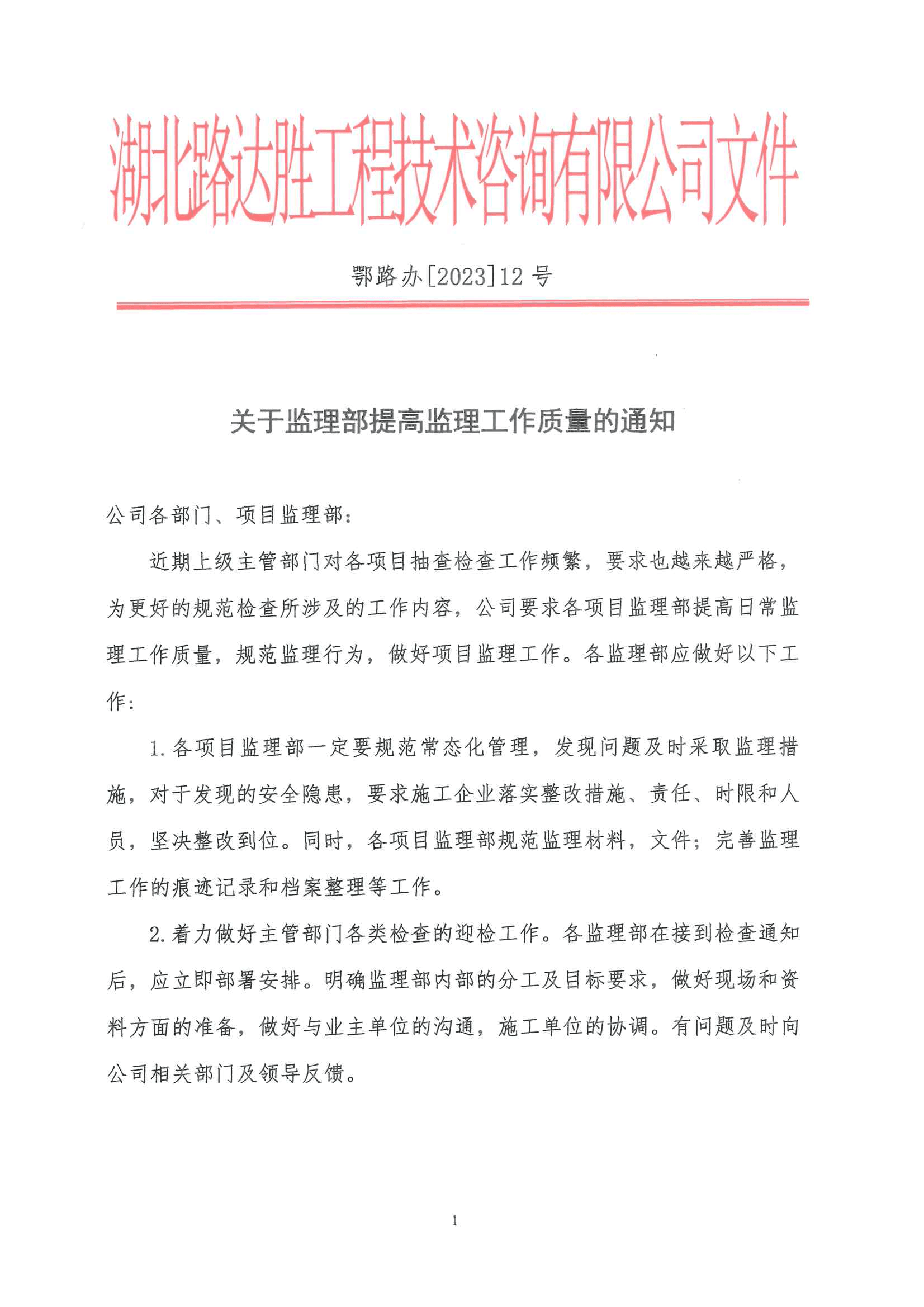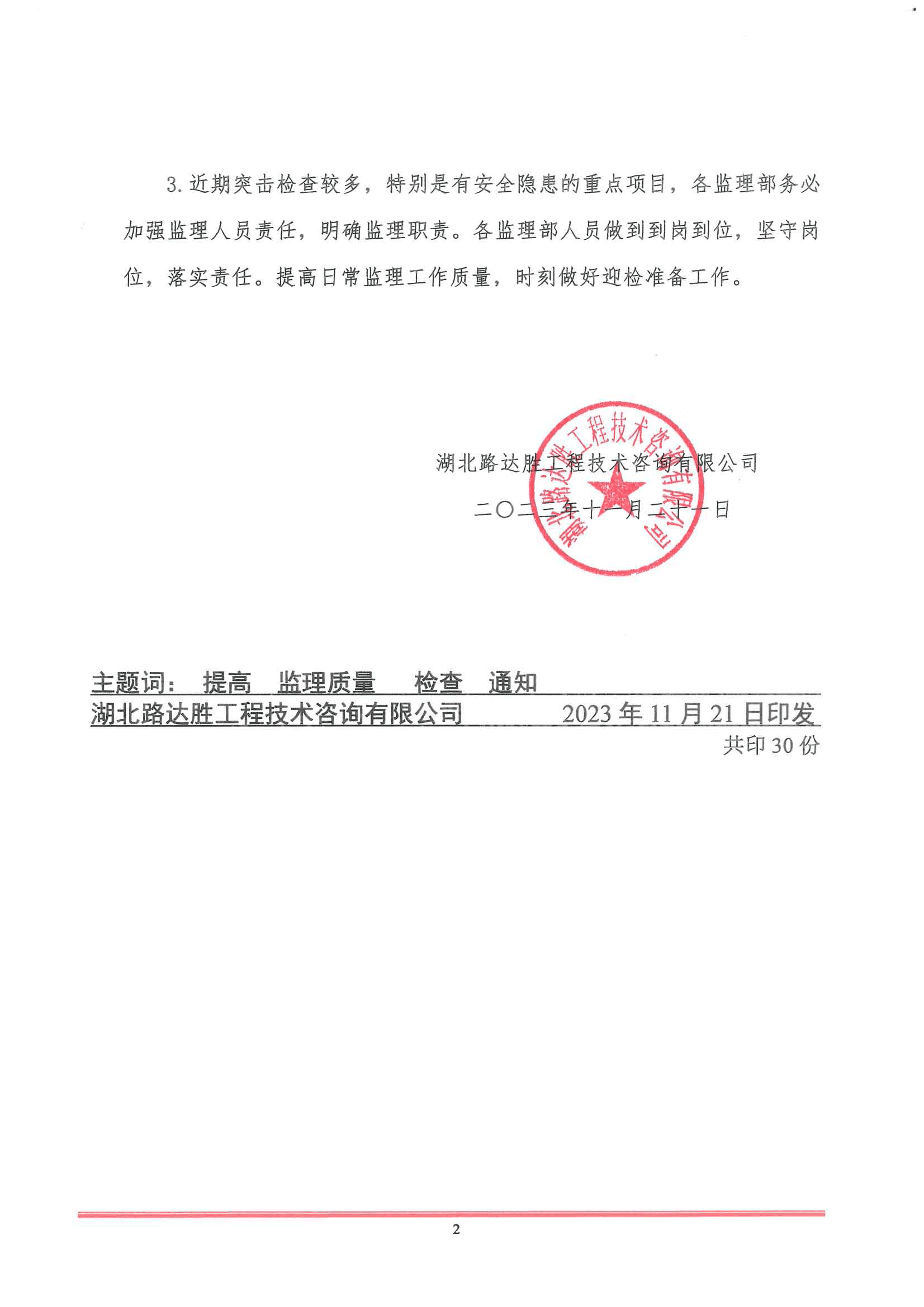 3.近期突击检查较多,特别是有安全隐患的重点项目,各监理部务必加强监理人员责任,明确监理职责。各监理部人员做到到岗到位,坚守岗位,落实责任。提高日常监理工作质量,时刻做好迎检准备工作。