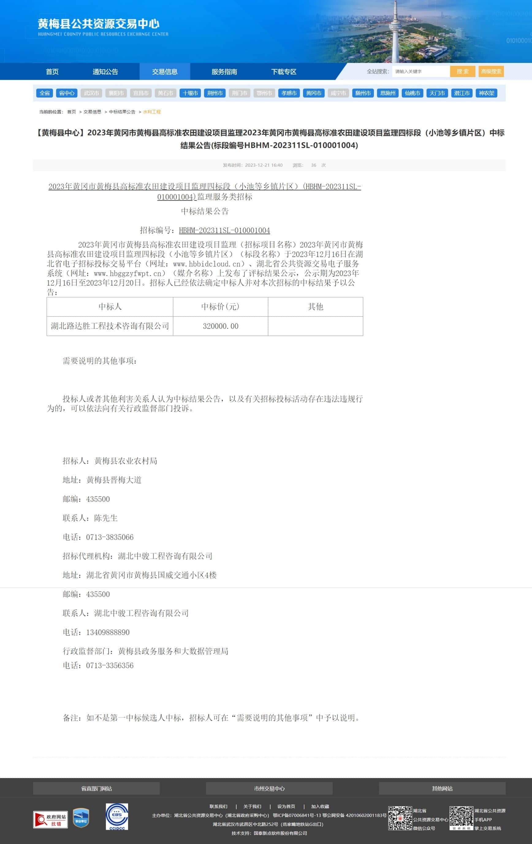 【黄梅县中心】2023年黄冈市黄梅县高标准农田建设项目监理2023年黄冈市黄梅县高标准农田建设项目监理四标段(小池等乡镇片区)中标结果公告(标段编号HBHM-202311SL-010001004)