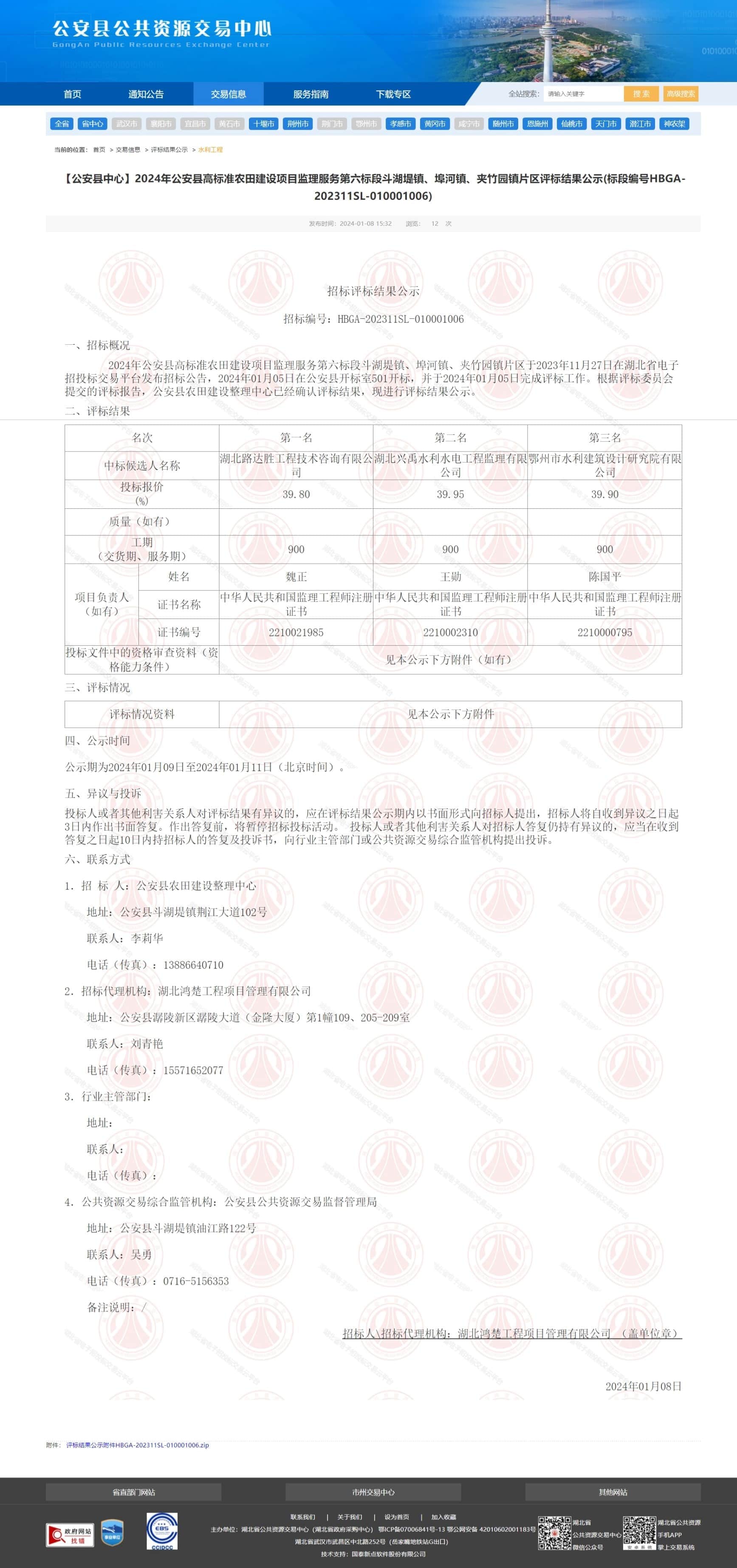 2024年公安县高标准农田建设项目监理服务第六标段斗湖堤镇、埠河镇、夹竹园镇片区于2023年11月27日在湖北省电子招投标交易平台发布招标公告,2024年01月05日在公安县开标室501开标,并于2024年01月05日完成评标工作。根据评标委员会提交的评标报告,公安县农田建设整理中心已经确认评标结果,现进行评标结果公示。