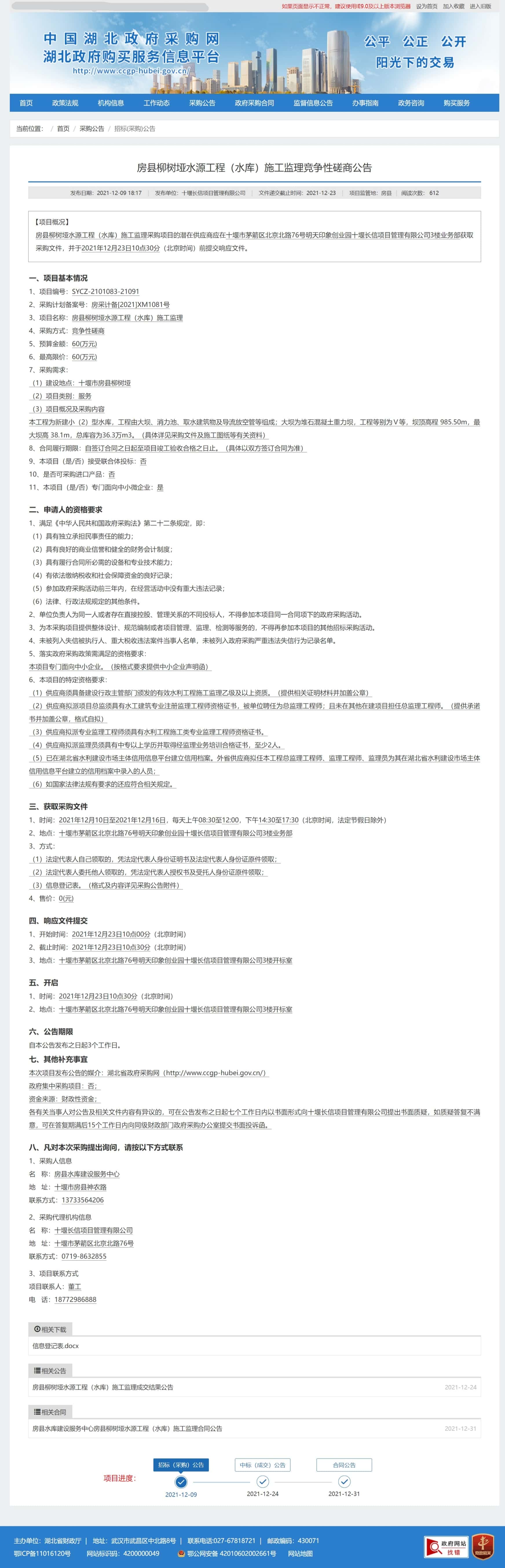 房县柳树垭水源工程(水库)施工监理采购项目的潜在供应商应在十堰市茅箭区北京北路76号明天印象创业园十堰长信项目管理有限公司3楼业务部获取采购文件,并于2021年12月23日10点30分(北京时间)前提交响应文件。
