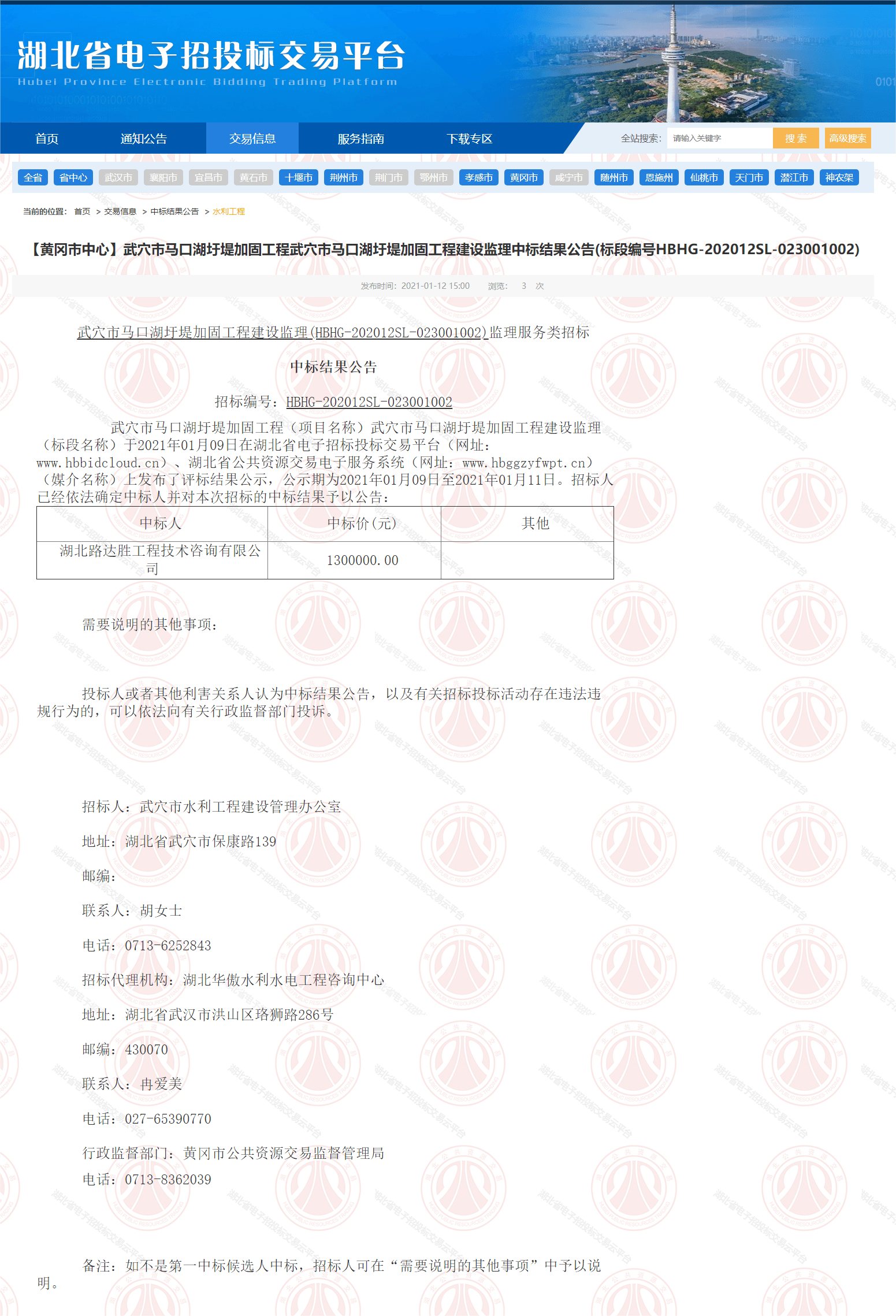 武穴市马口湖圩堤加固工程(项目名称)武穴市马口湖圩堤加固工程建设监理(标段名称)于2021年01月09日在湖北省电子招标投标交易平台(网址:www.hbbidcloud.cn)、湖北省公共资源交易电子服务系统(网址:www.hbggzyfwpt.cn)(媒介名称)上发布了评标结果公示,公示期为2021年01月09日至2021年01月11日。招标人已经依法确定中标人并对本次招标的中标结果予以公告:
