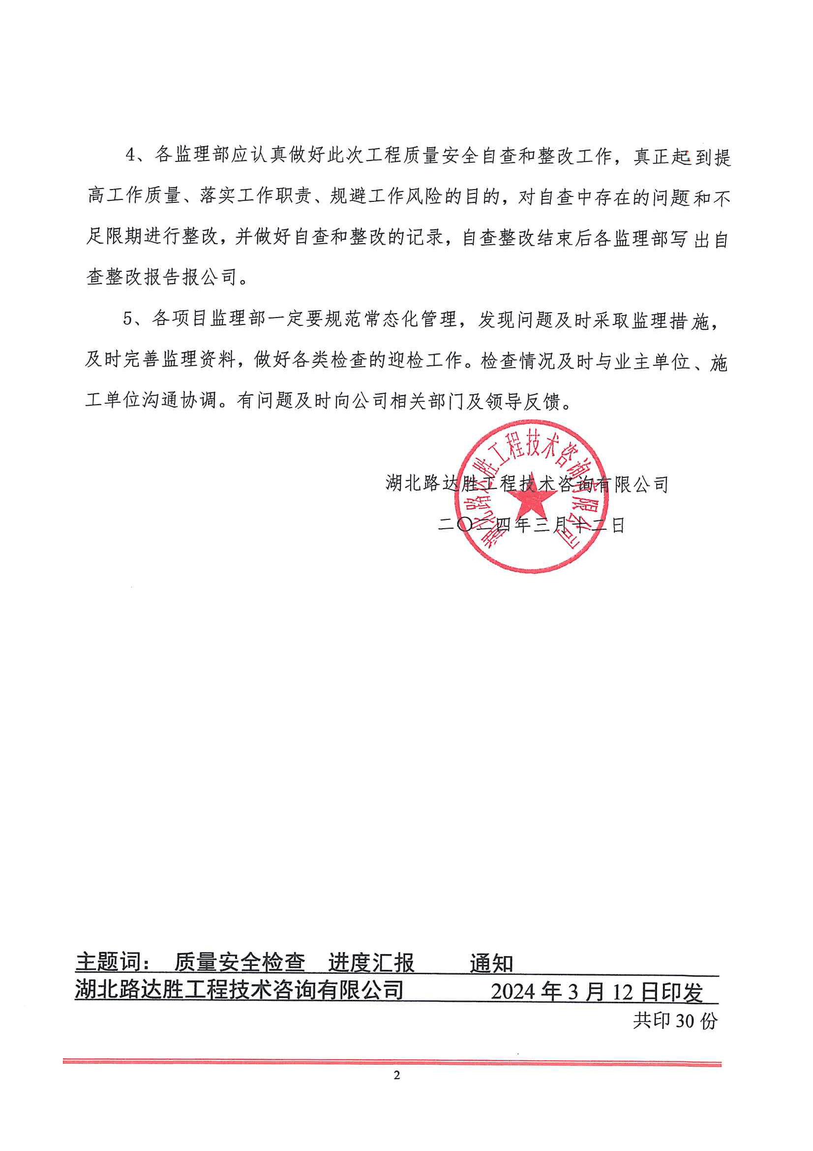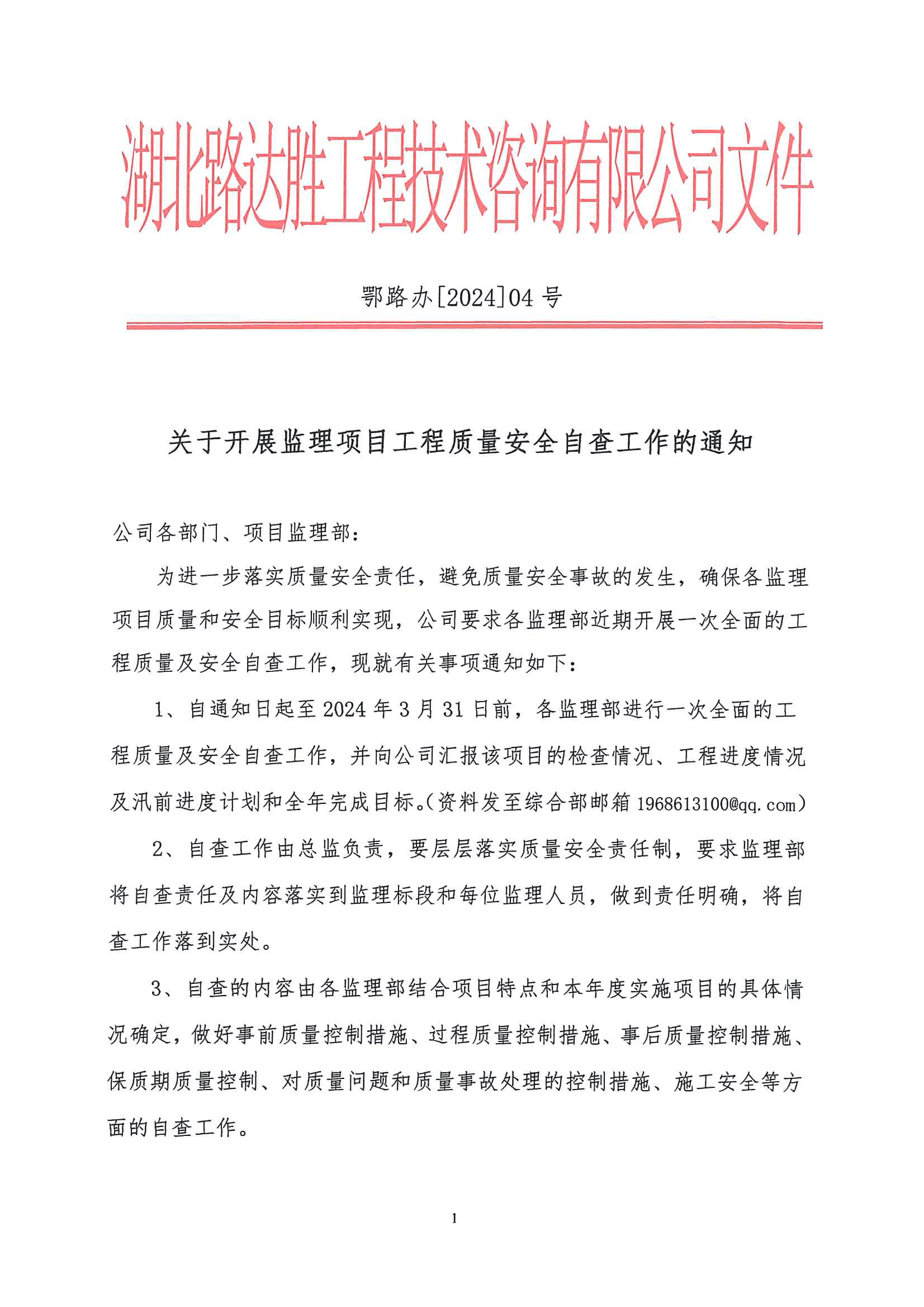 关于开展监理项目工程质量安全自查工作的通知