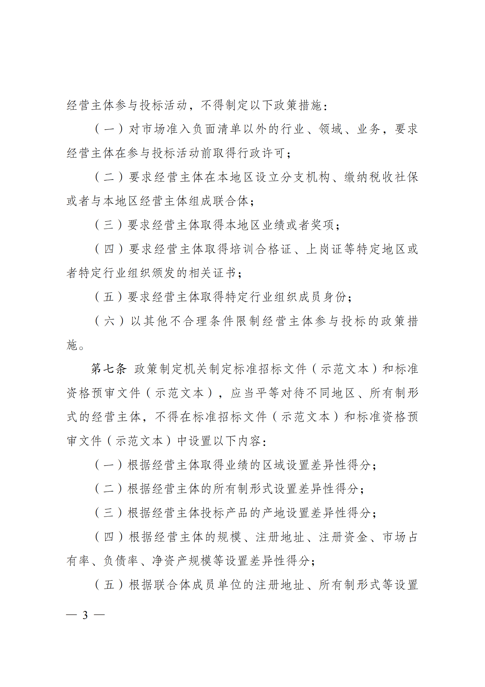 第六条 政策制定机关应当落实全国统一的市场准入条件,对经营主体参与投标活动,不得制定以下政策措施: