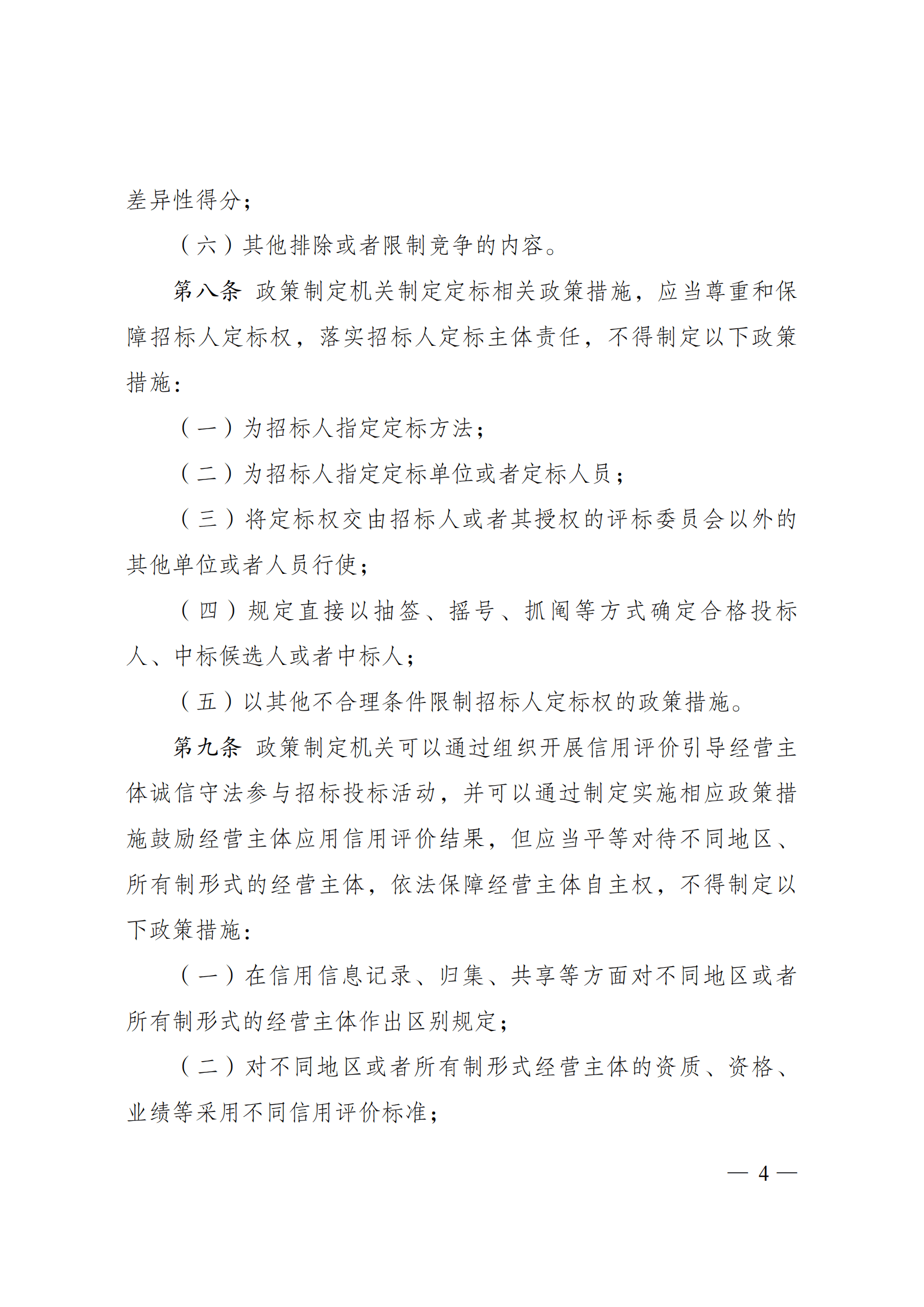 第九条 政策制定机关可以通过组织开展信用评价引导经营主体诚信守法参与招标投标活动,并可以通过制定实施相应政策措施鼓励经营主体应用信用评价结果,但应当平等对待不同地区、所有制形式的经营主体,依法保障经营主体自主权,不得制定以下政策措施: