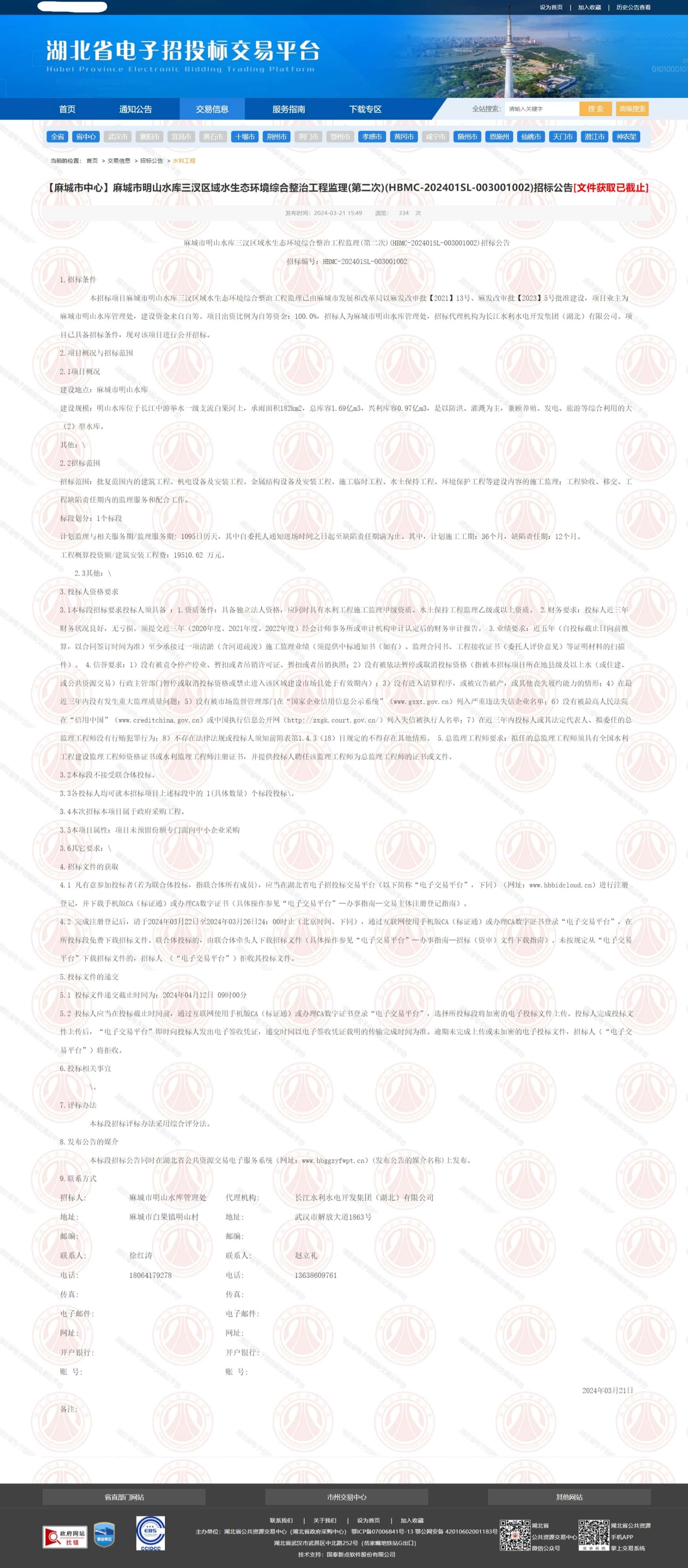 麻城市明山水库三汊区域水生态环境综合整治工程监理(第二次)招标公告