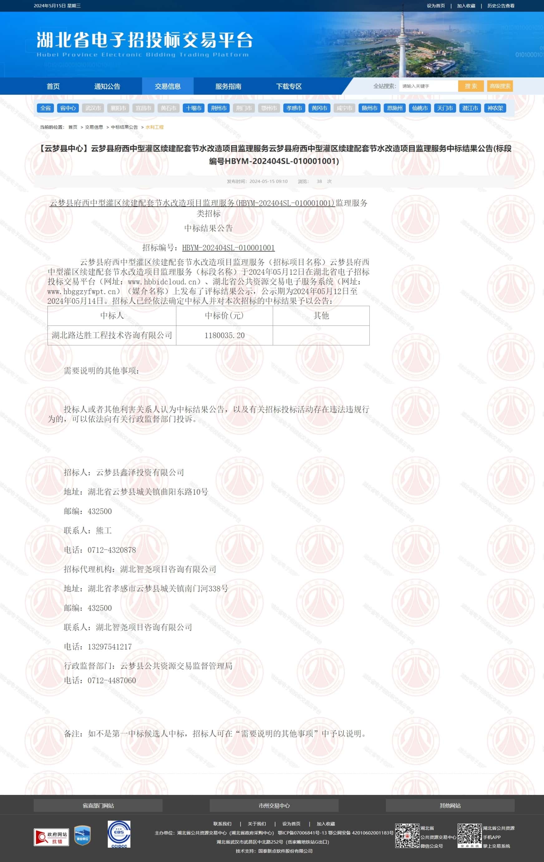 云梦县府西中型灌区续建配套节水改造项目监理服务(招标项目名称)云梦县府西中型灌区续建配套节水改造项目监理服务(标段名称)于2024年05月12日在湖北省电子招标投标交易平台(网址:www.hbbidcloud.cn)、湖北省公共资源交易电子服务系统(网址:www.hbggzyfwpt.cn)(媒介名称)上发布了评标结果公示,公示期为2024年05月12日至2024年05月14日。招标人已经依法确定中标人并对本次招标的中标结果予以公告: