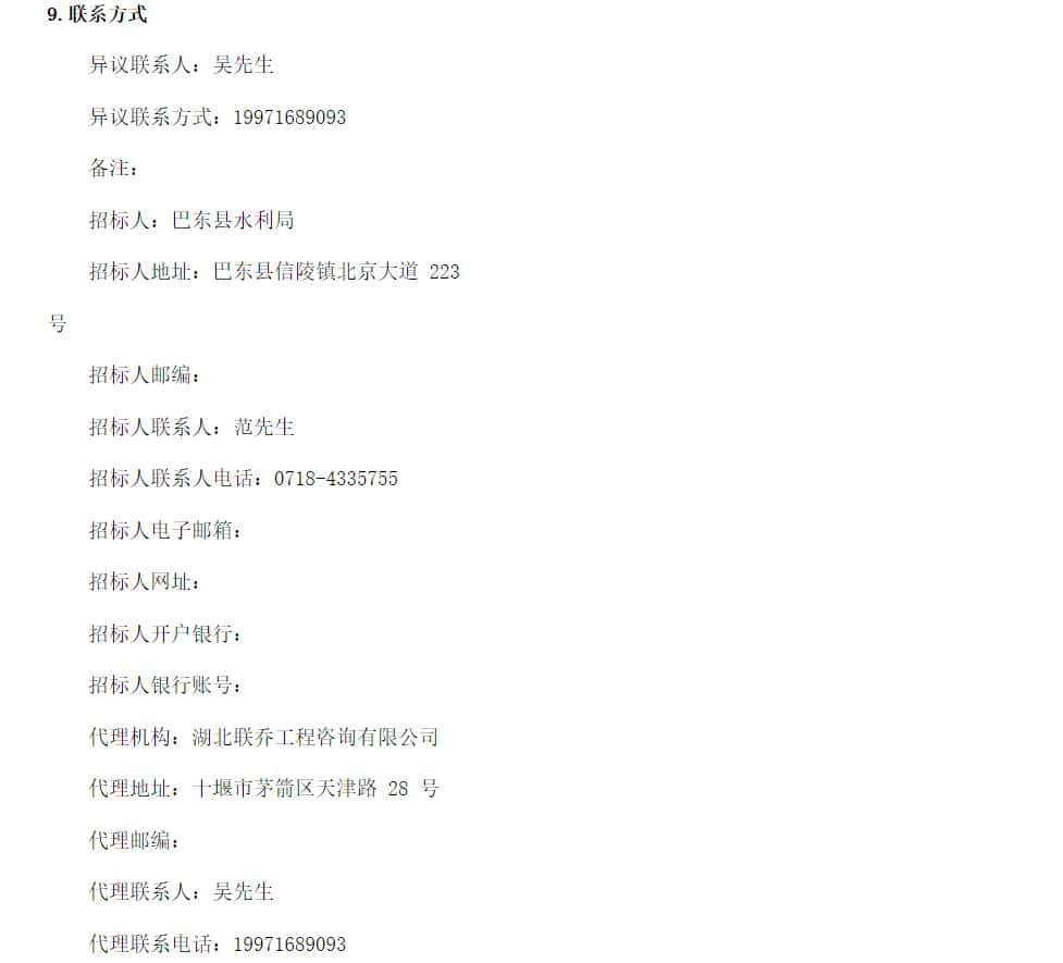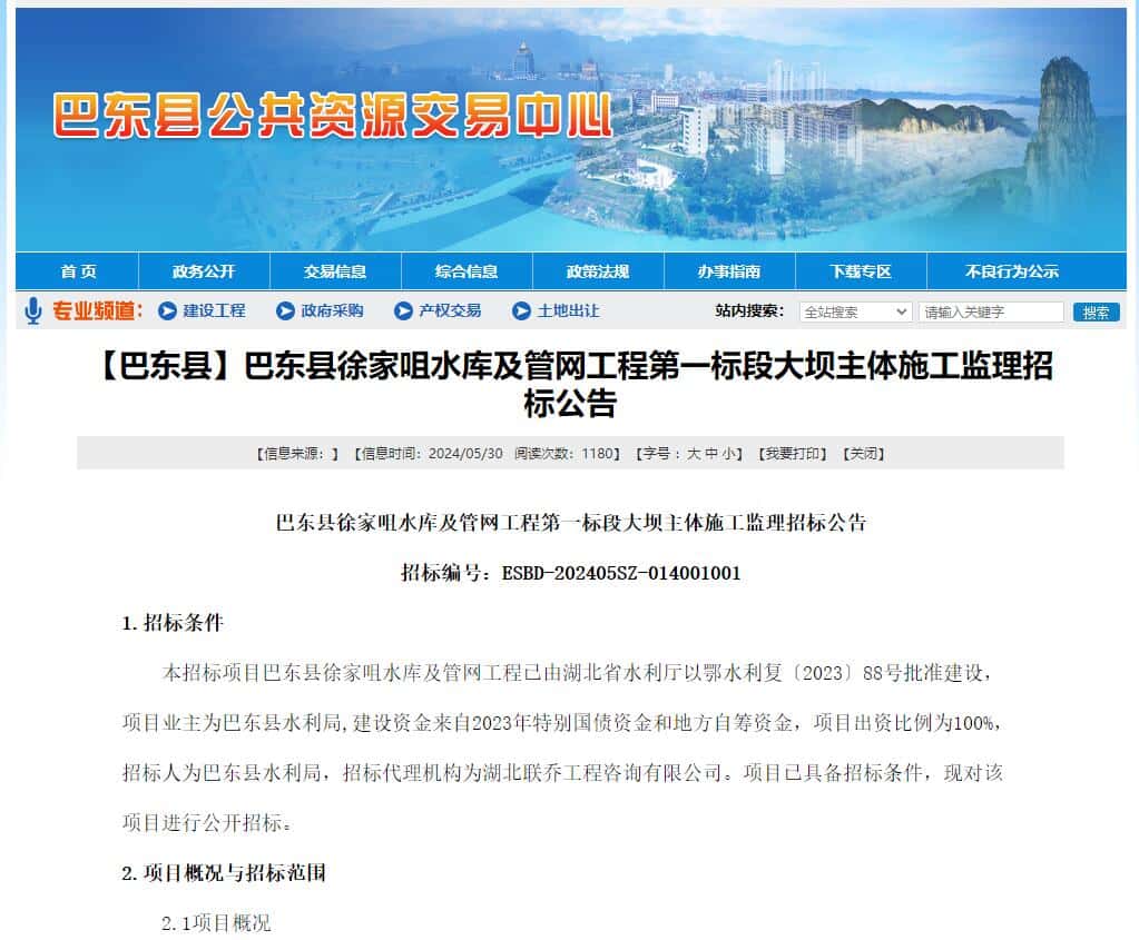 巴东县徐家咀水库及管网工程第一标段大坝主体施工监理招标公告