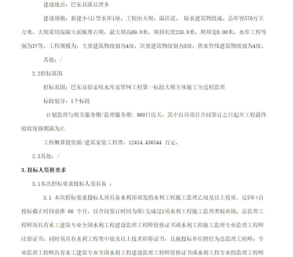 招标范围:巴东县徐家咀水库及管网工程第一标段大坝主体施工全过程监理