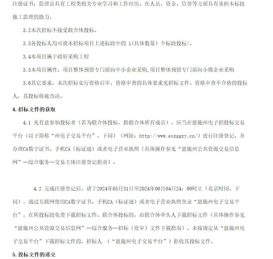 4.2 完成注册登记后,请于2024年05月31日至2024年06月04日24:00时止(北京时间、下同),通过互联网使用CA数字证书、手机CA(标证通)或者电子营业执照登录“恩施州电子交易平台”,在所投标段免费下载招标文件。联合体投标的,由联合体牵头人下载招标文件(具体操作参见“恩施州公共资源交易信息网”—综合服务—招标(资审)文件下载指南)。未按规定从“恩施州电子交易平台”下载招标文件的,招标人 (“恩施州电子交易平台”)拒收其投标文件。
