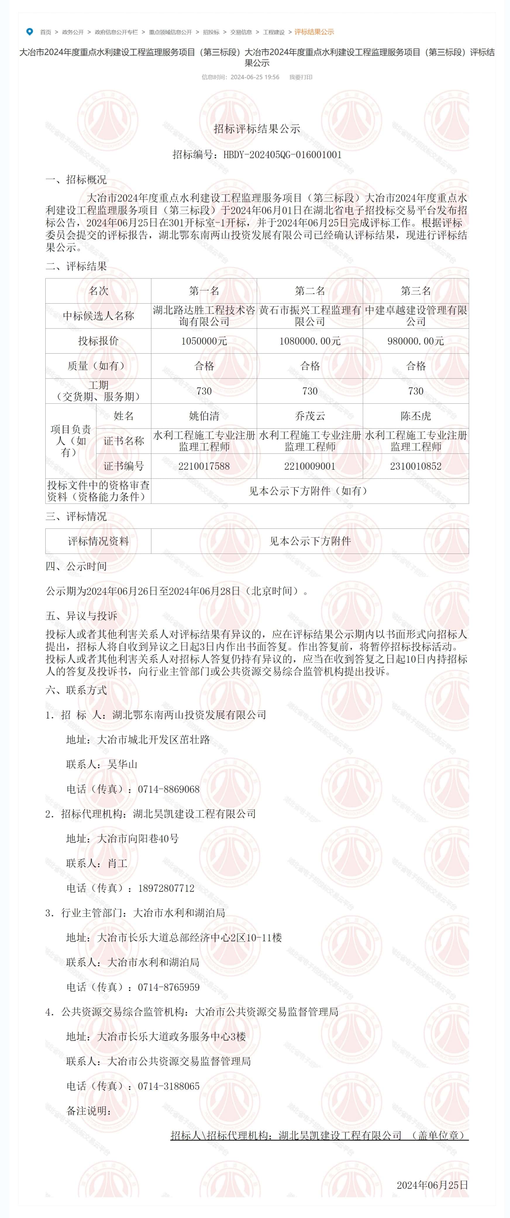 大冶市2024年度重点水利建设工程监理服务项目(第三标段)大冶市2024年度重点水利建设工程监理服务项目(第三标段)于2024年06月01日在湖北省电子招投标交易平台发布招标公告,2024年06月25日在301开标室-1开标,并于2024年06月25日完成评标工作。根据评标委员会提交的评标报告,湖北鄂东南两山投资发展有限公司已经确认评标结果,现进行评标结果公示。