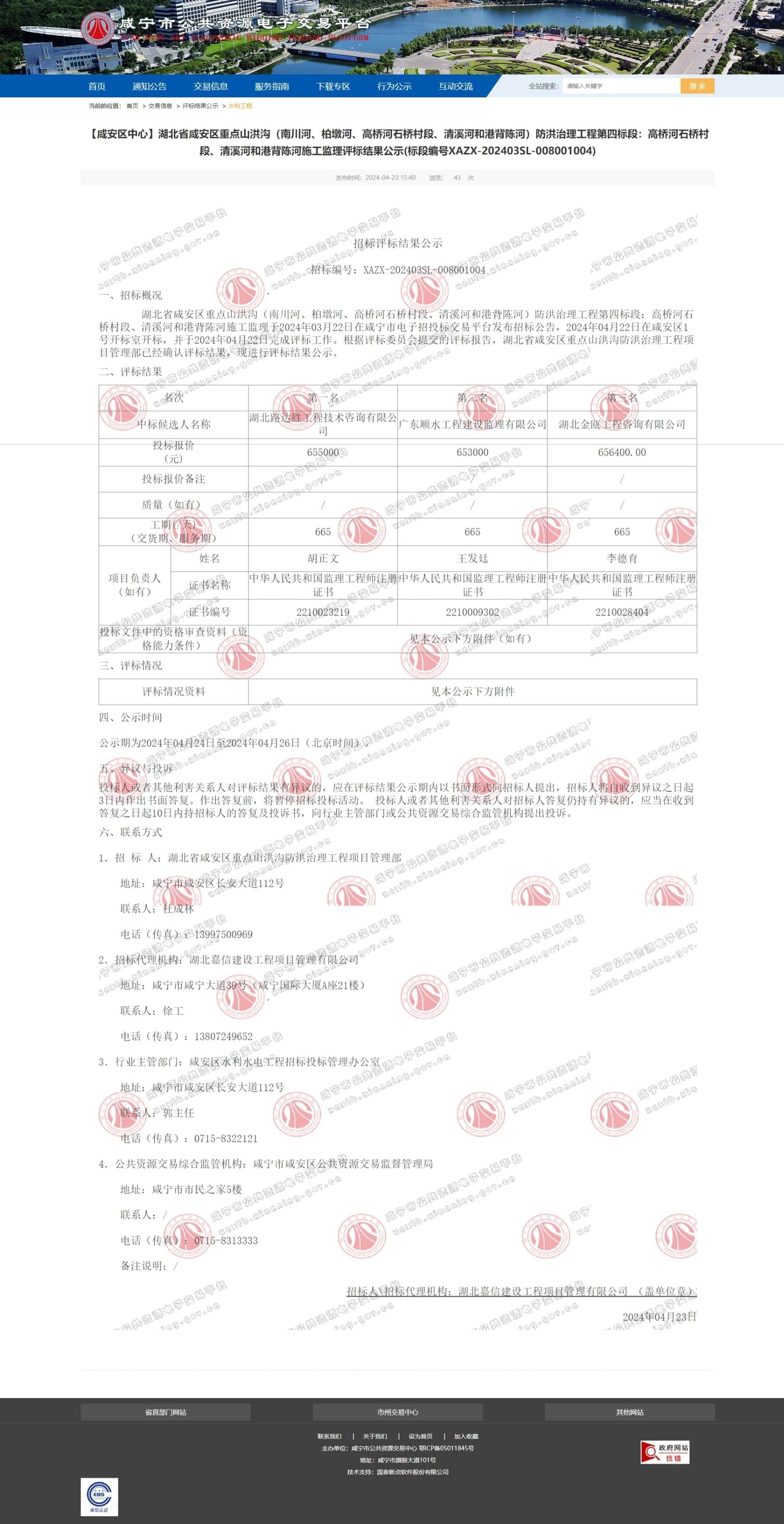 【咸安区中心】湖北省咸安区重点山洪沟(南川河、柏墩河、高桥河石桥村段、清溪河和港背陈河)防洪治理工程第四标段:高桥河石桥村段、清溪河和港背陈河施工监理评标结果公示(标段编号XAZX-202403SL-008001004)