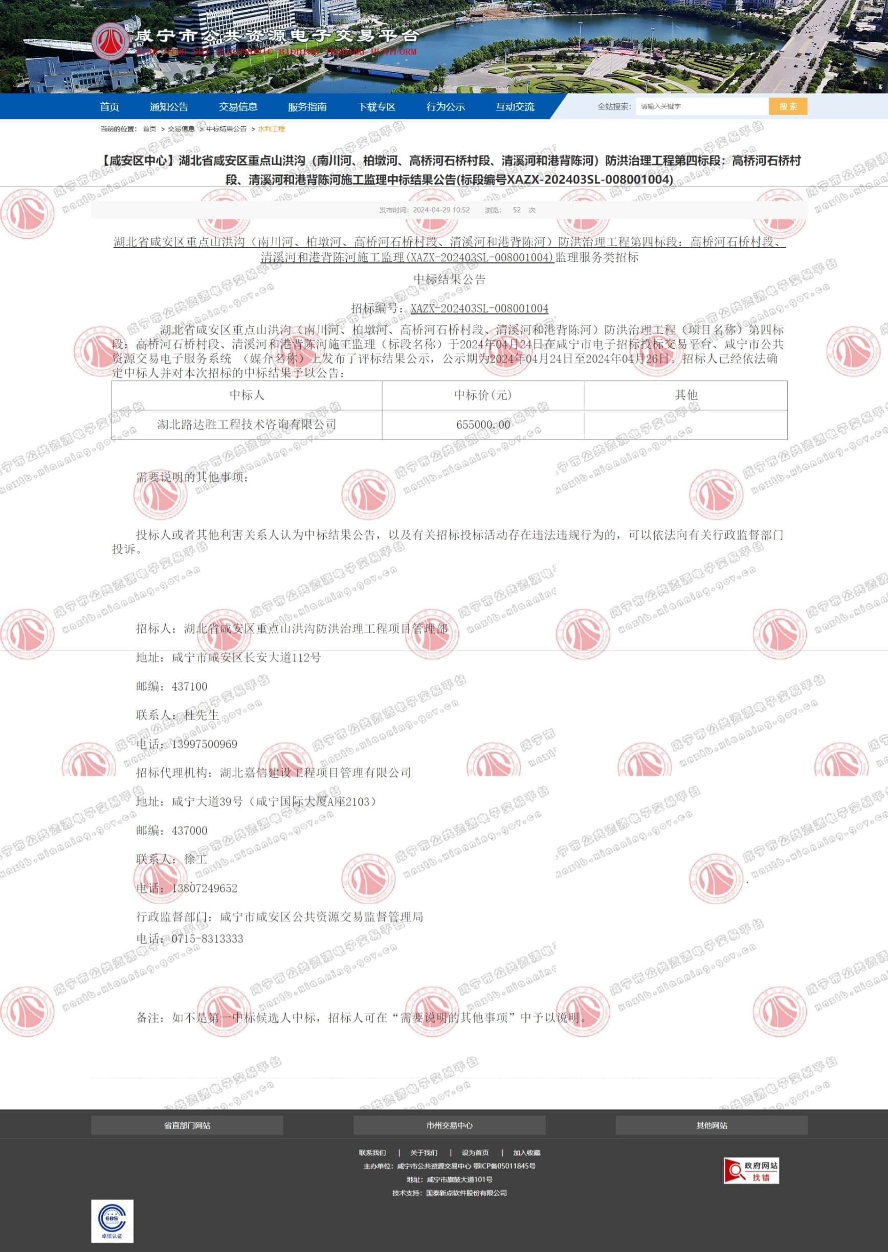 【咸安区中心】湖北省咸安区重点山洪沟(南川河、柏墩河、高桥河石桥村段、清溪河和港背陈河)防洪治理工程第四标段:高桥河石桥村段、清溪河和港背陈河施工监理中标结果公告(标段编号XAZX-202403SL-008001004)