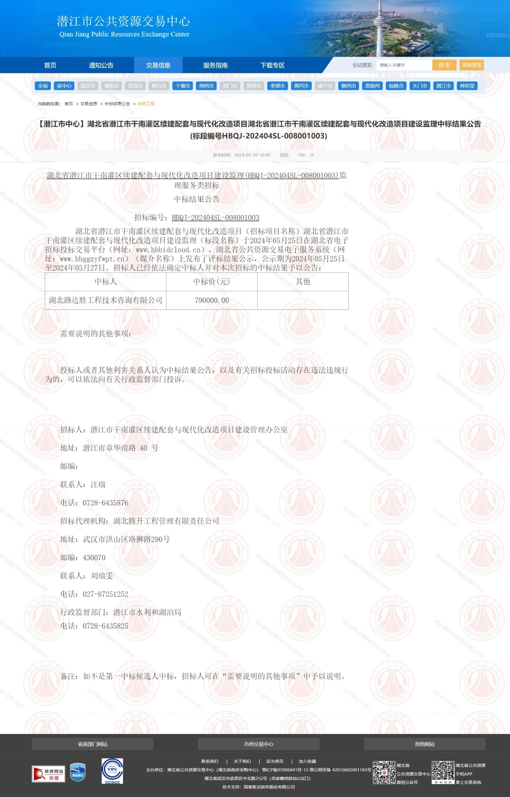 【潜江市中心】湖北省潜江市干南灌区续建配套与现代化改造项目湖北省潜江市干南灌区续建配套与现代化改造项目建设监理中标结果公告(标段编号HBQJ-202404SL-008001003)