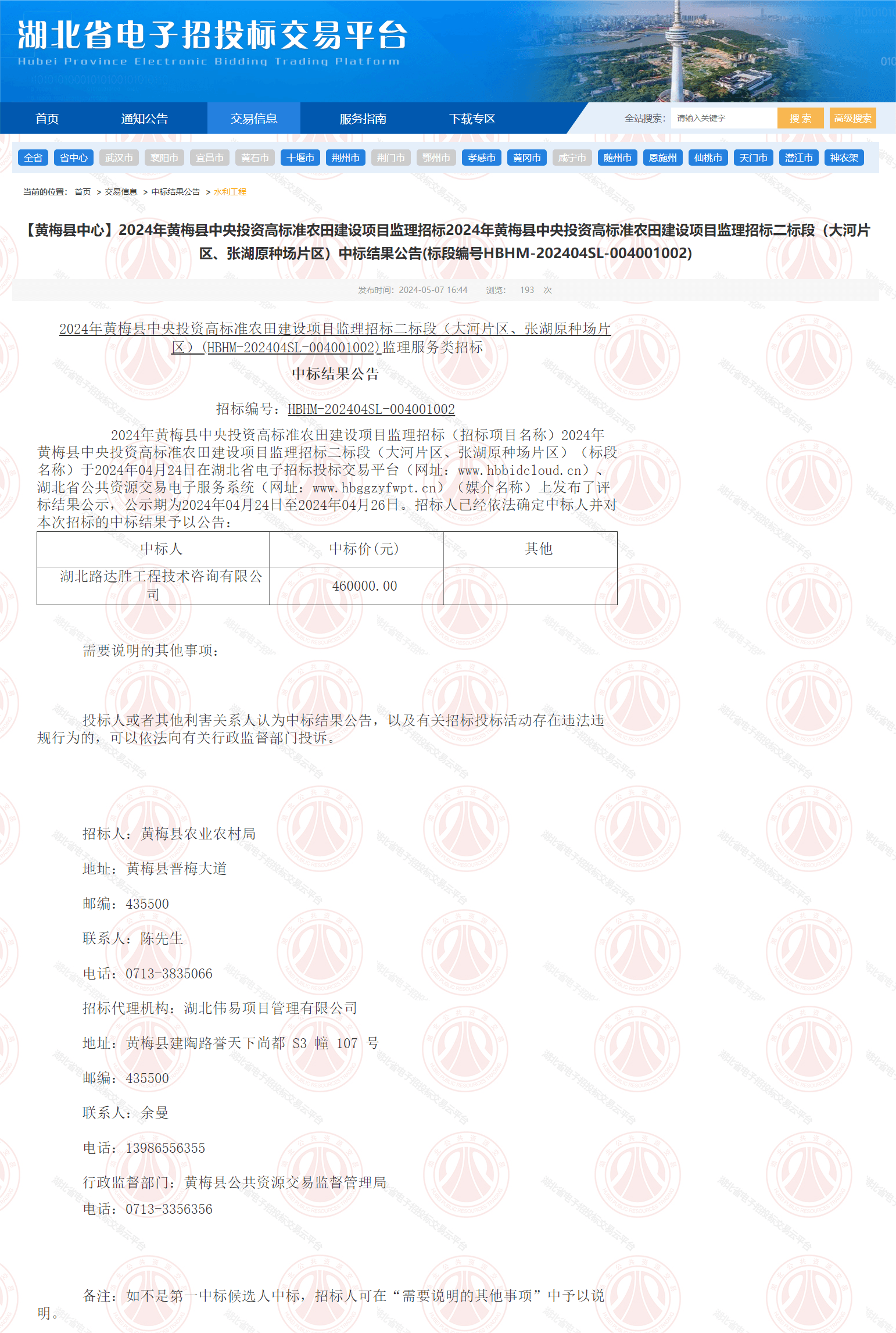 2024年黄梅县中央投资高标准农田建设项目监理招标(招标项目名称)2024年黄梅县中央投资高标准农田建设项目监理招标二标段(大河片区、张湖原种场片区)(标段名称)于2024年04月24日在湖北省电子招标投标交易平台(网址:www.hbbidcloud.cn)、湖北省公共资源交易电子服务系统(网址:www.hbggzyfwpt.cn)(媒介名称)上发布了评标结果公示,公示期为2024年04月24日至2024年04月26日。招标人已经依法确定中标人并对本次招标的中标结果予以公告: