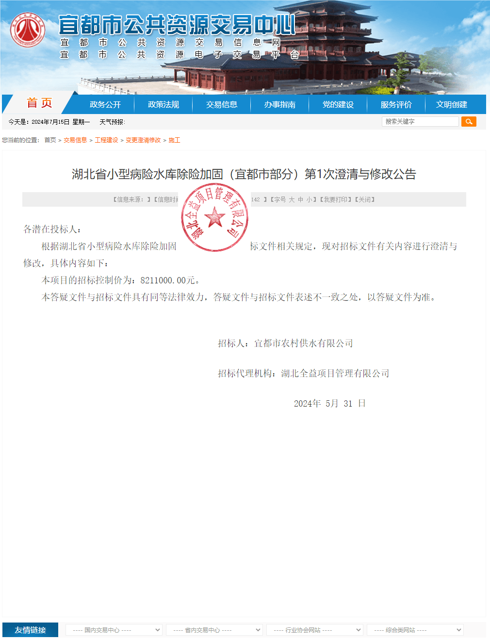 根据湖北省小型病险水库除险加固(宜都市部分)招标文件相关规定,现对招标文件有关内容进行澄清与修改,具体内容如下: