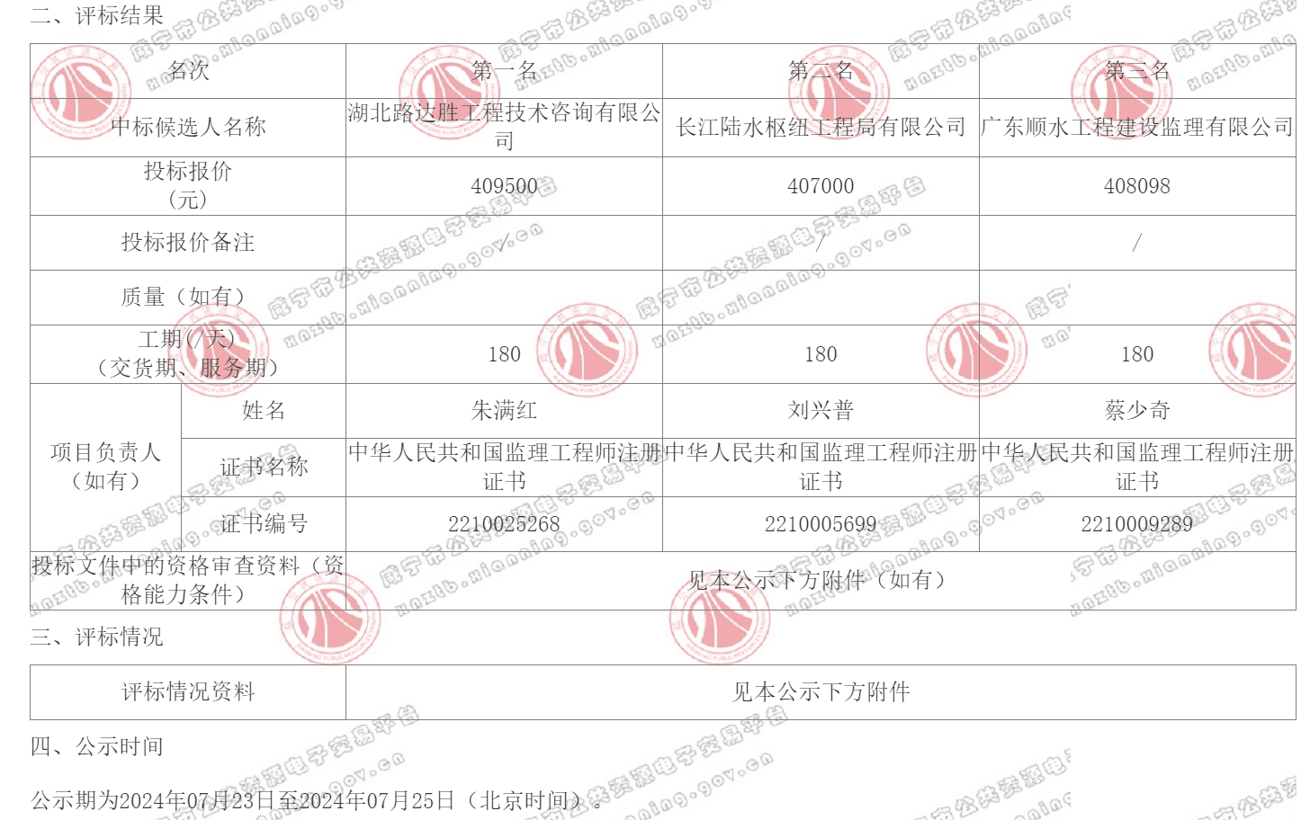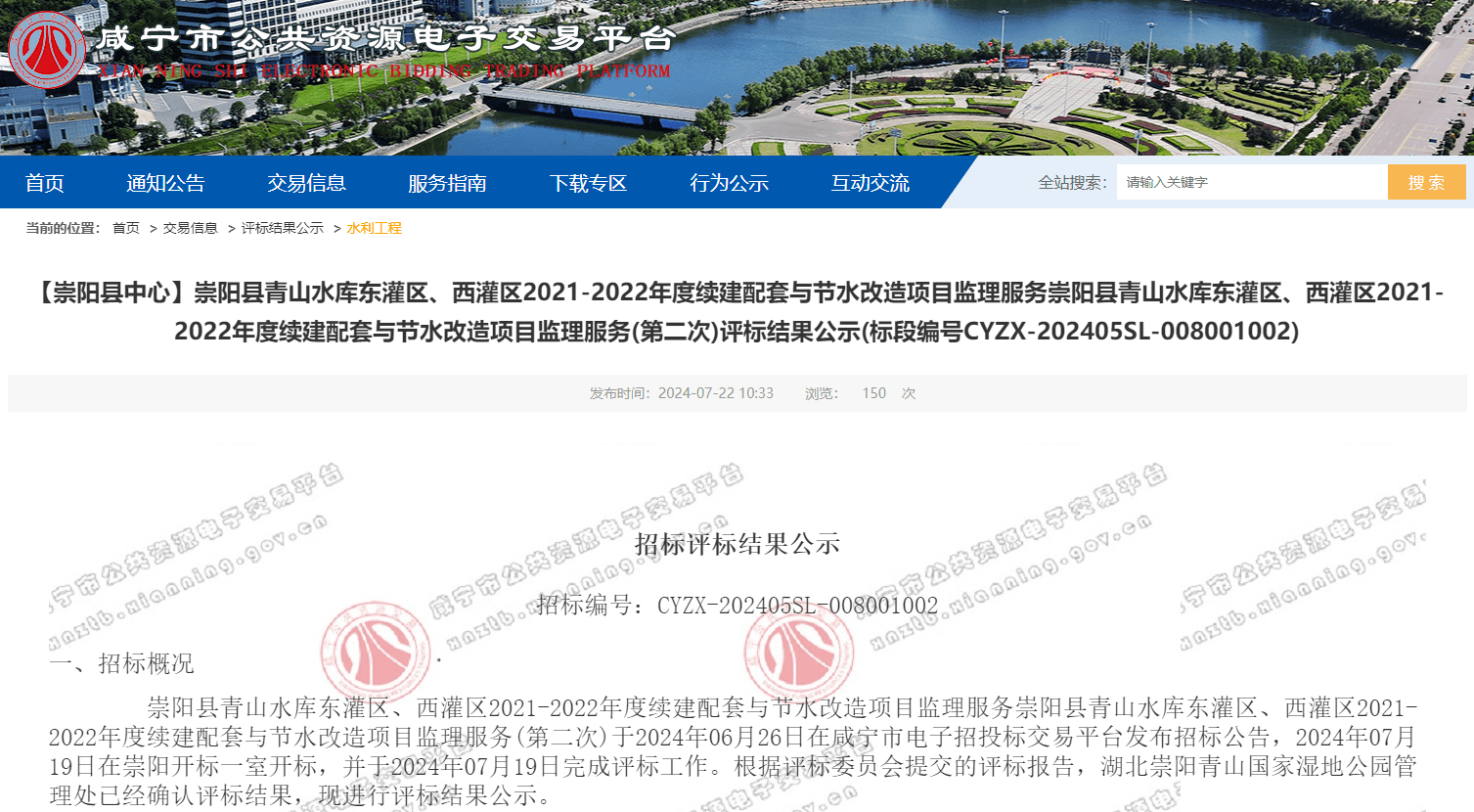 崇阳县青山水库东灌区、西灌区2021-2022年度续建配套与节水改造项目监理服务崇阳县青山水库东灌区、西灌区2021-2022年度续建配套与节水改造项目监理服务(第二次)于2024年06月26日在咸宁市电子招投标交易平台发布招标公告,2024年07月19日在崇阳开标一室开标,并于2024年07月19日完成评标工作。根据评标委员会提交的评标报告,湖北崇阳青山国家湿地公园管理处已经确认评标结果,现进行评标结果公示。