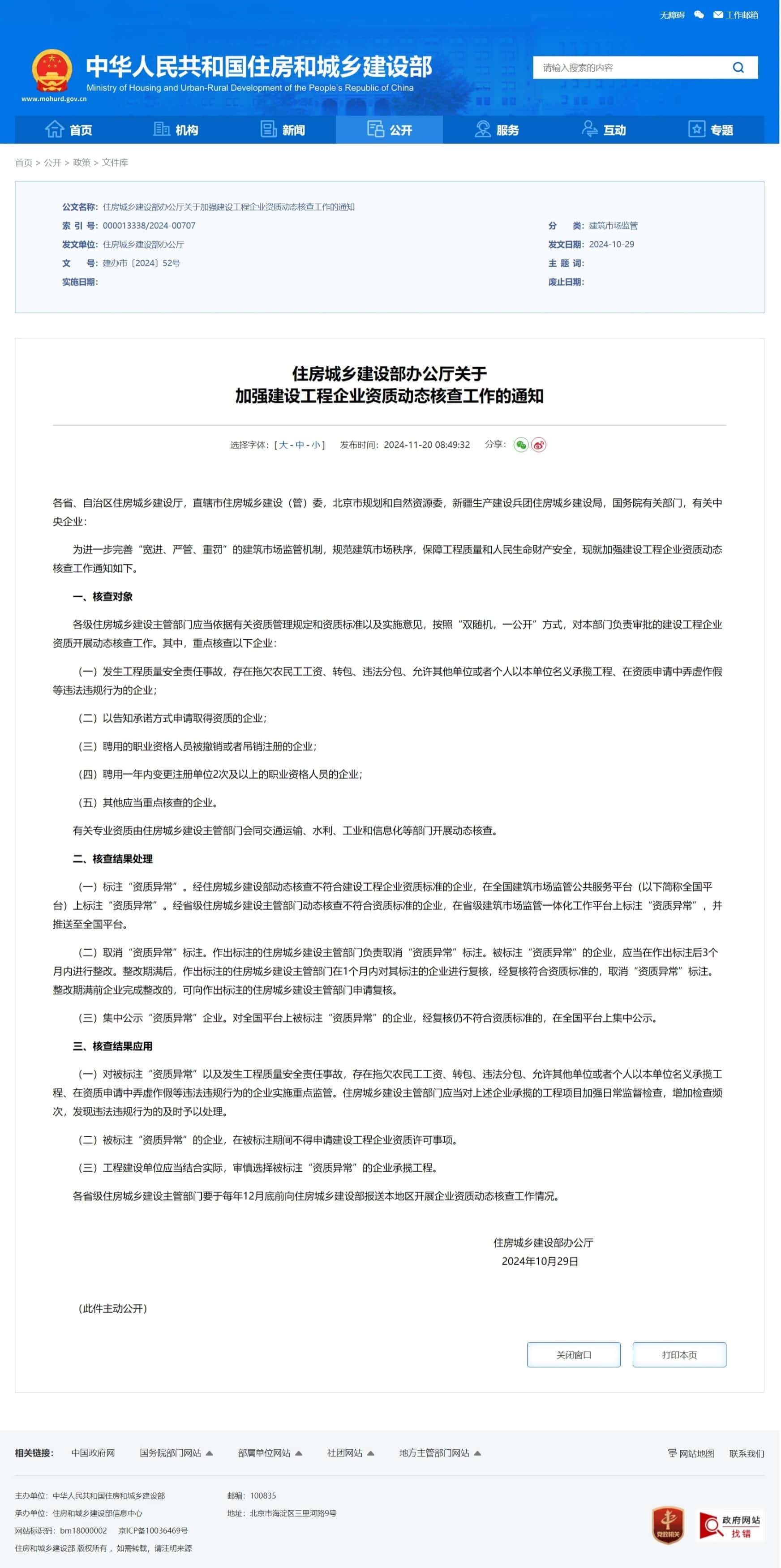 (一)标注“资质异常”。经住房城乡建设部动态核查不符合建设工程企业资质标准的企业,在全国建筑市场监管公共服务平台(以下简称全国平台)上标注“资质异常”。经省级住房城乡建设主管部门动态核查不符合资质标准的企业,在省级建筑市场监管一体化工作平台上标注“资质异常”,并推送至全国平台。