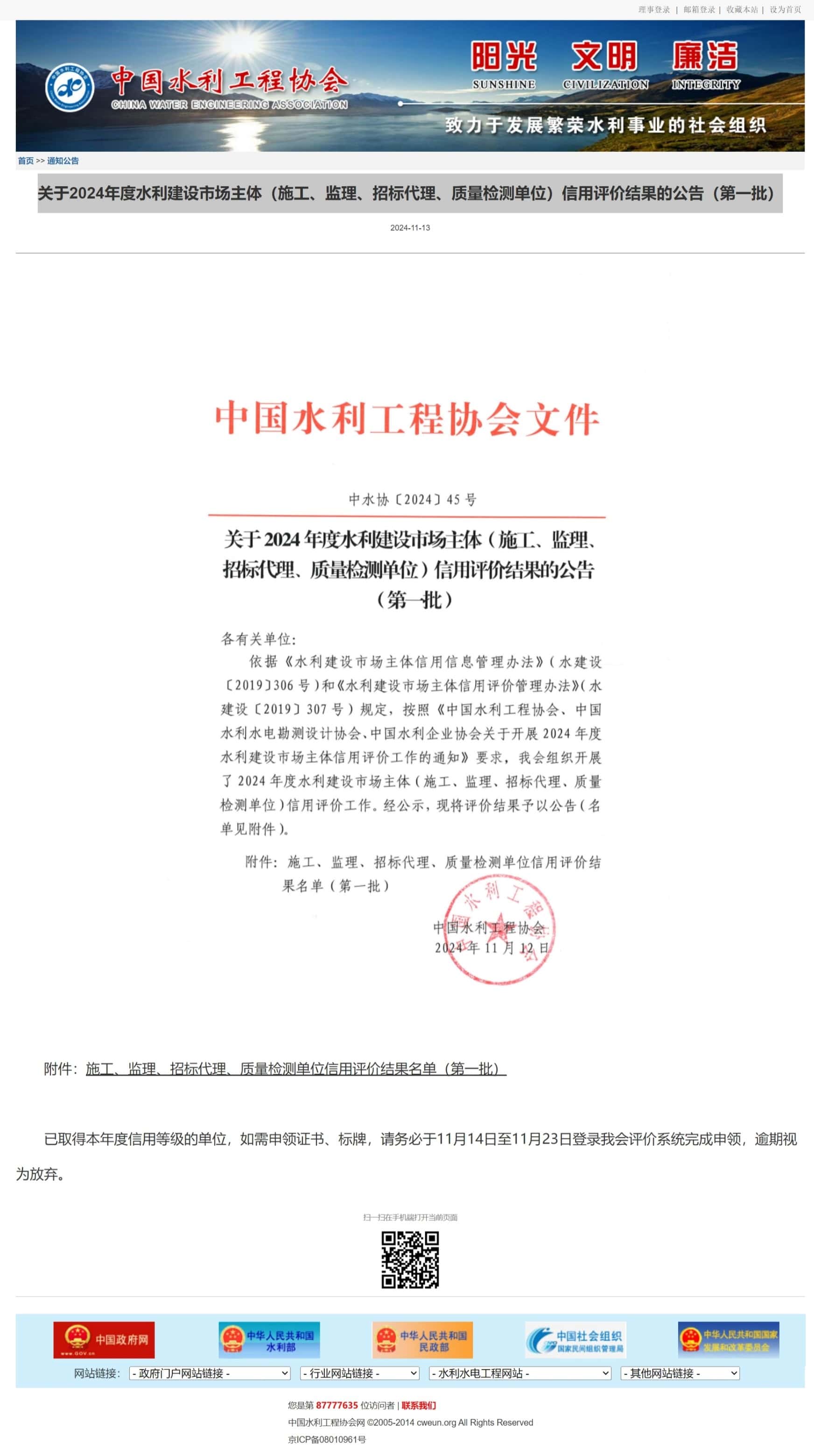 关于2024年度水利建设市场主体(施工、监理、招标代理、质量检测单位)信用评价结果的公告(第一批)