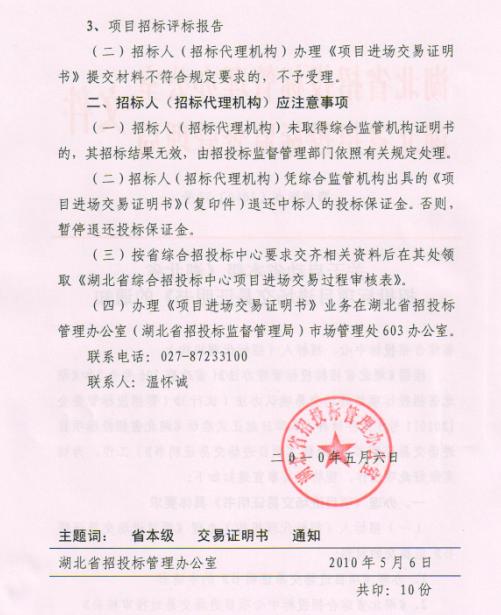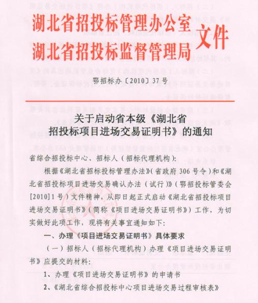 关于启动省本级《湖北省招投标项目进场交易证明书》的通知