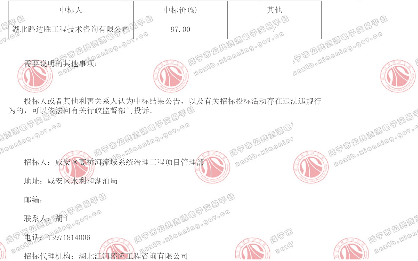 咸安区高桥河流域系统治理工程(项目名称)咸安区高桥河流域系统治理工程建设监理(标段名称)于2020年12月17日在咸宁市电子招标投标交易平台、咸宁市公共资源交易电子服务系统 (媒介名称)上发布了评标结果公示,公示期为2020年12月17日至2020年12月21日。招标人已经依法确定中标人并对本次招标的中标结果予以公告: