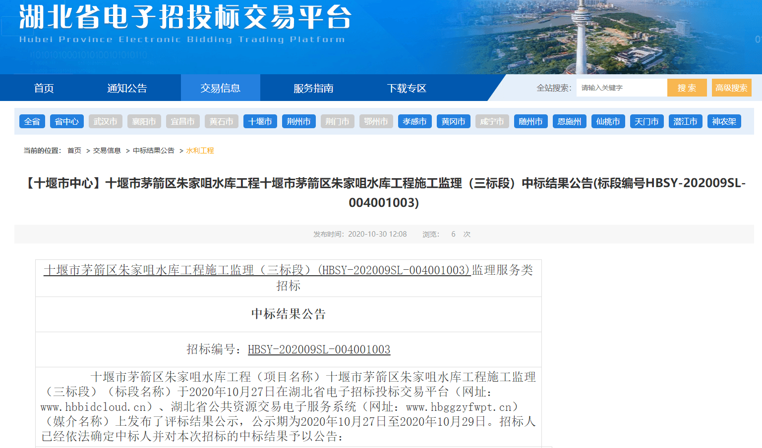 十堰市茅箭区朱家咀水库工程(项目名称)十堰市茅箭区朱家咀水库工程施工监理(三标段)(标段名称)于2020年10月27日在湖北省电子招标投标交易平台(网址:www.hbbidcloud.cn)、湖北省公共资源交易电子服务系统(网址:www.hbggzyfwpt.cn)(媒介名称)上发布了评标结果公示,公示期为2020年10月27日至2020年10月29日。招标人已经依法确定中标人并对本次招标的中标结果予以公告: