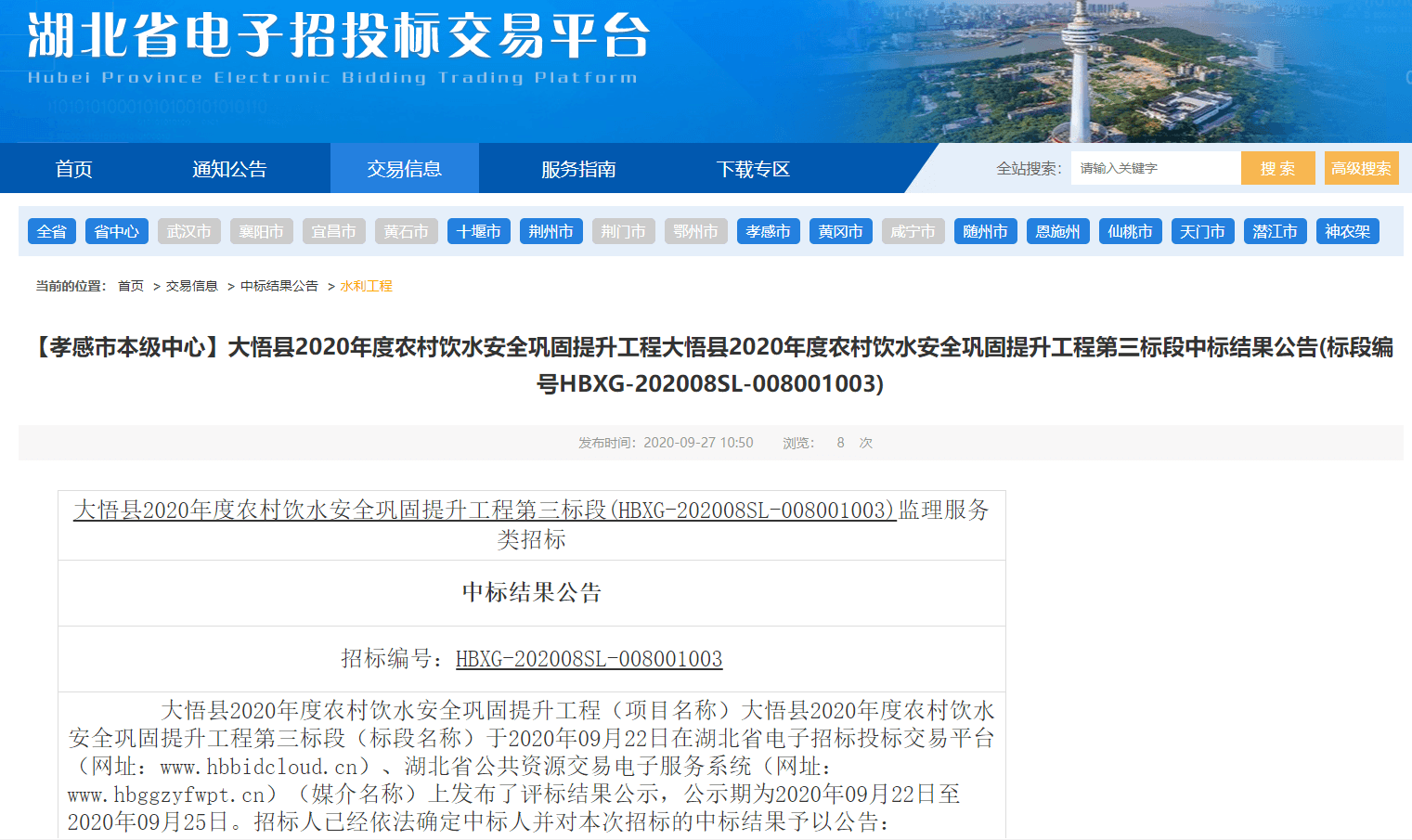 大悟县2020年度农村饮水安全巩固提升工程第三标段(HBXG-202008SL-008001003)监理服务类招标