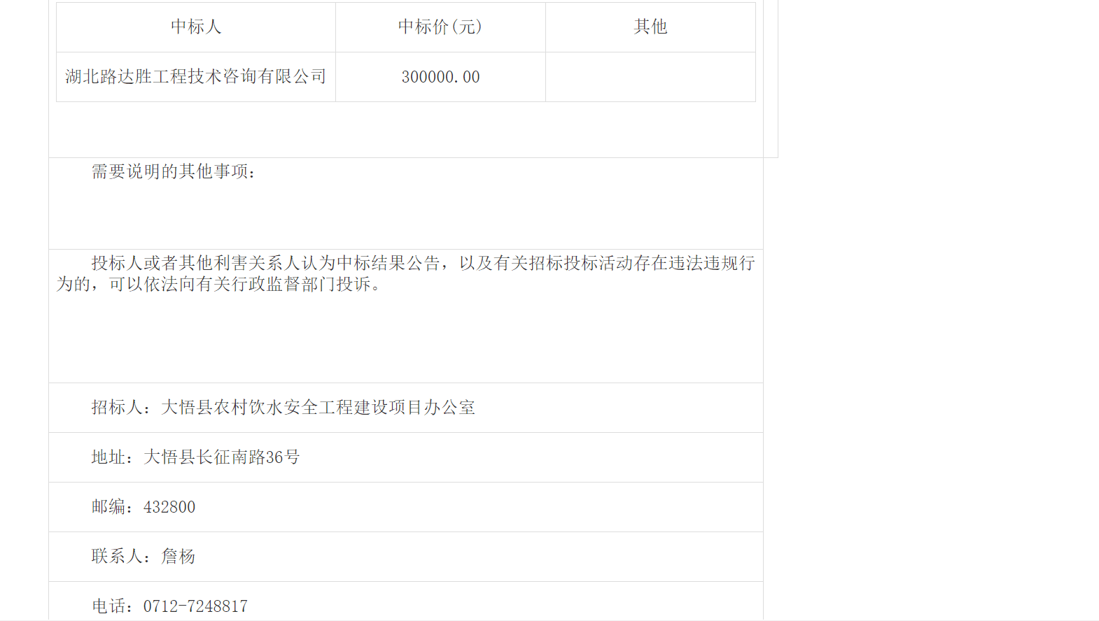 | 招标人:大悟县农村饮水安全工程建设项目办公室 | |||||||