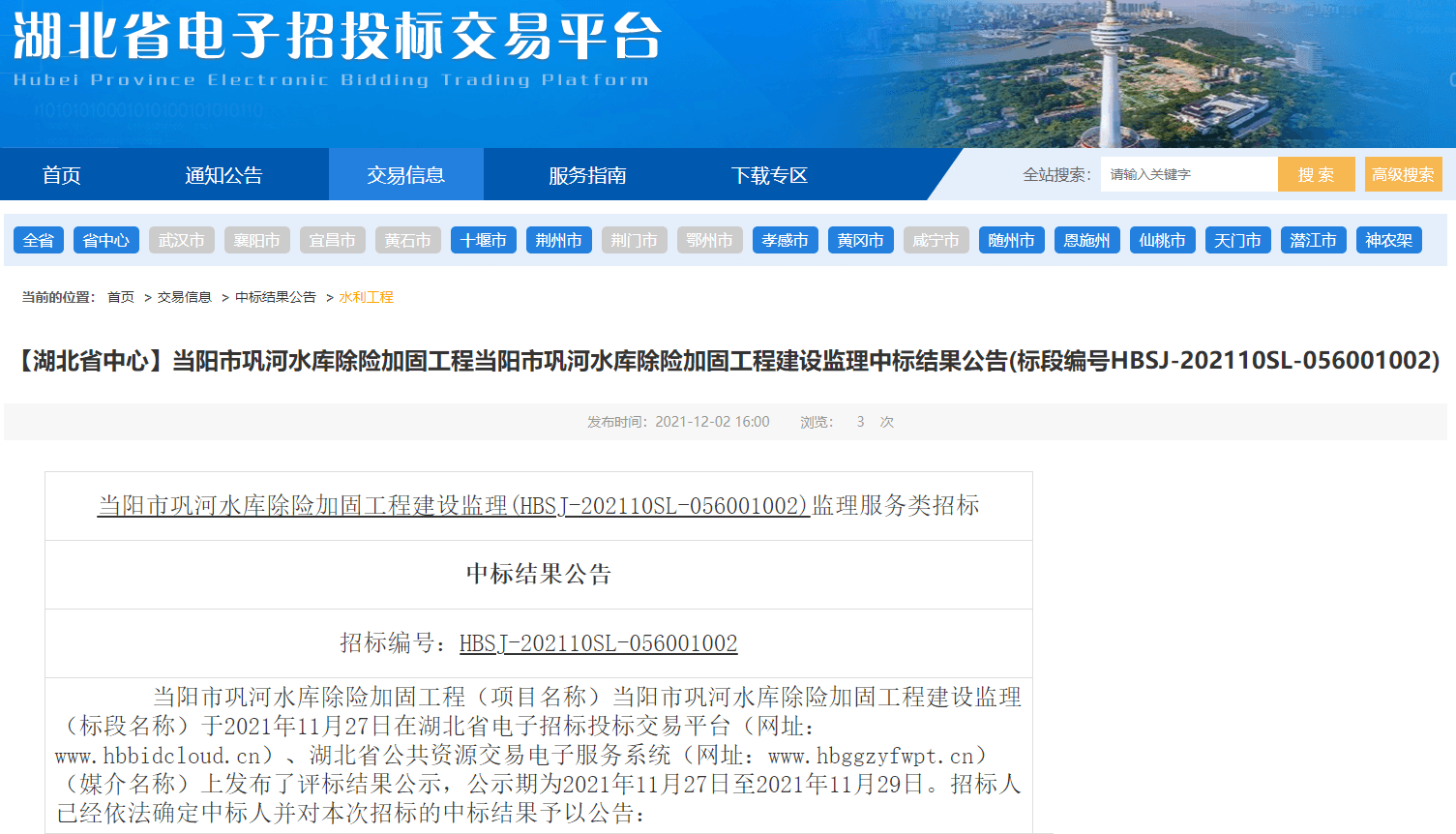 当阳市巩河水库除险加固工程(项目名称)当阳市巩河水库除险加固工程建设监理(标段名称)于2021年11月27日在湖北省电子招标投标交易平台(网址:www.hbbidcloud.cn)、湖北省公共资源交易电子服务系统(网址:www.hbggzyfwpt.cn)(媒介名称)上发布了评标结果公示,公示期为2021年11月27日至2021年11月29日。招标人已经依法确定中标人并对本次招标的中标结果予以公告: