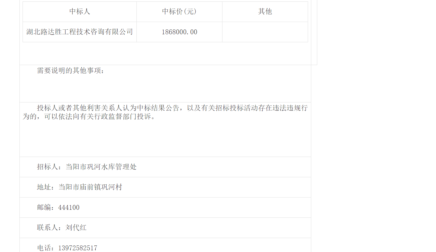 | 招标人:当阳市巩河水库管理处 | |||||||