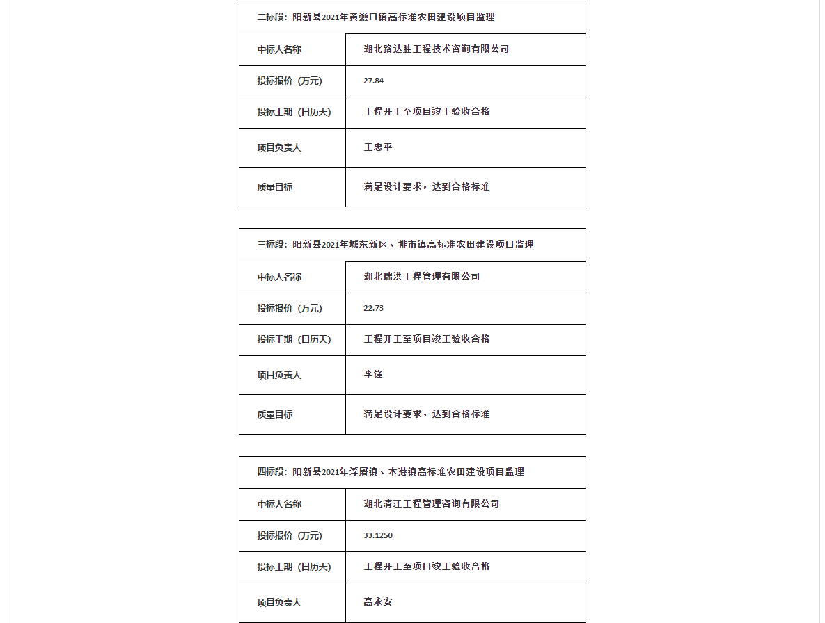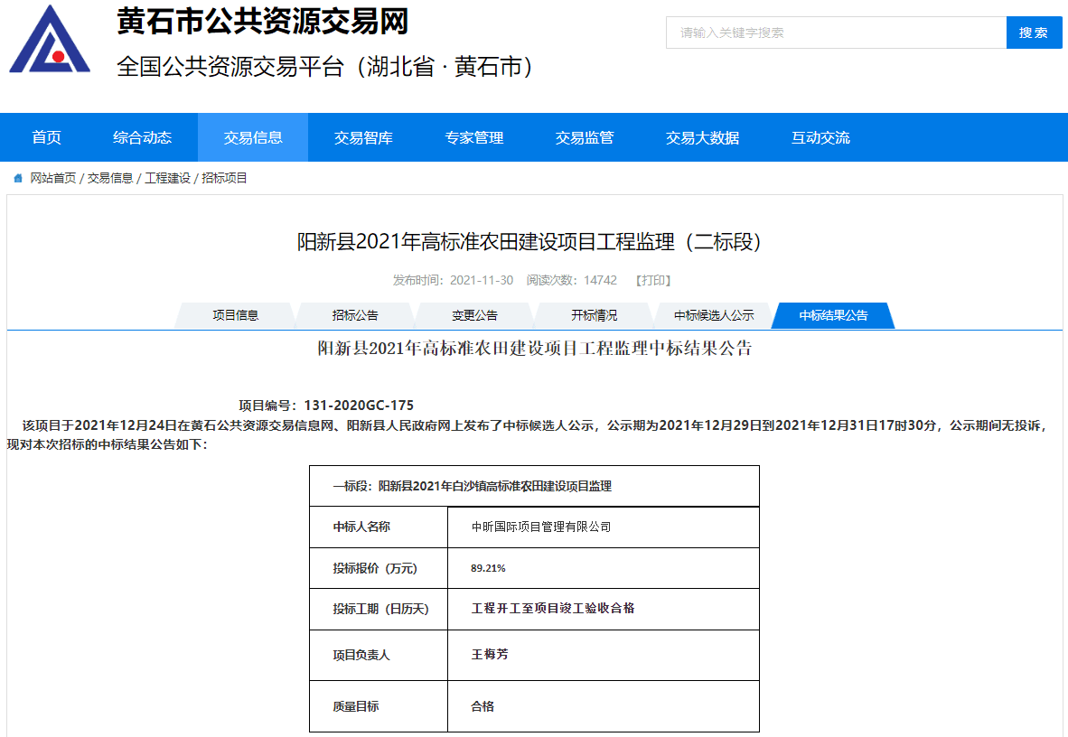 阳新县2021年高标准农田建设项目工程监理中标结果公告