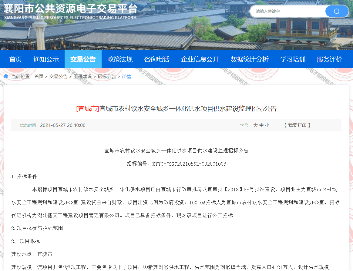 宜城市农村饮水安全城乡一体化供水项目供水建设监理招标公告