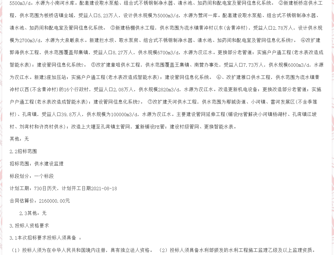 | 招标范围:供水建设监理 标段划分:一个标段 计划工期:730日历天,计划开工日期2021-08-18 合同估算价:2160000.00元 |